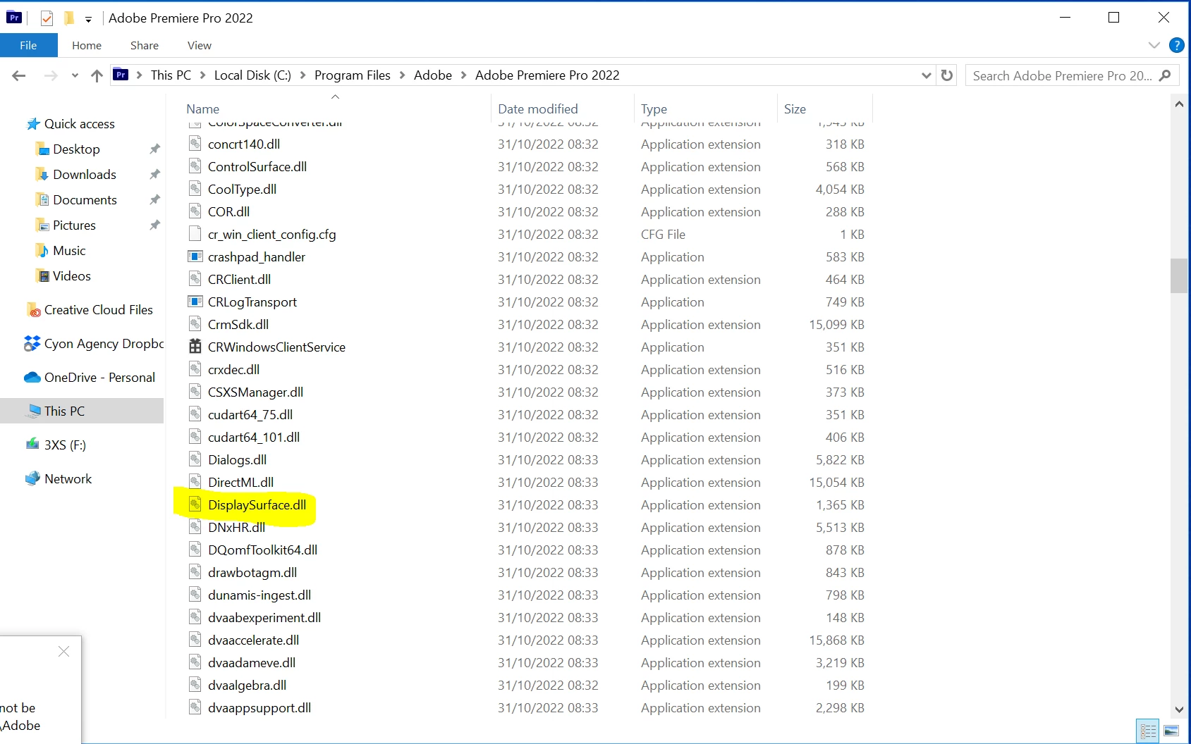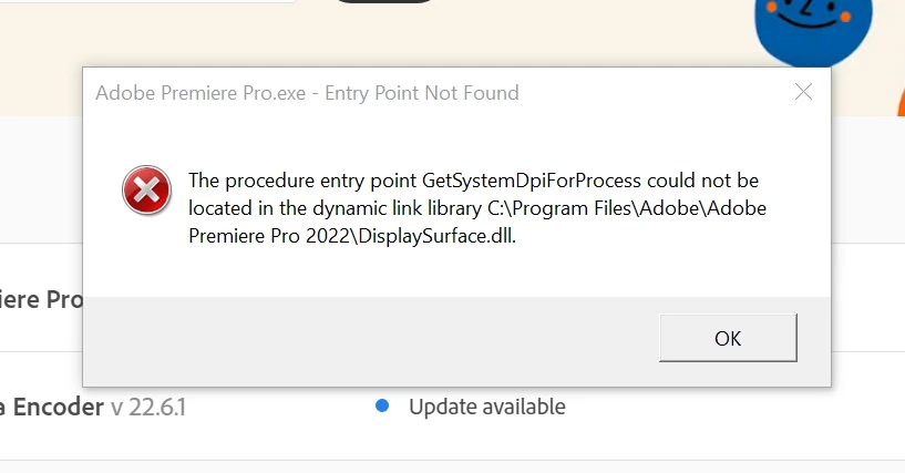 The procedure entry point GetSystemDpiForProcess could not be located in the dynamic link library C:\Program Files\Adobe\Adobe Media Encoder 2022\DisplaySurface.dll