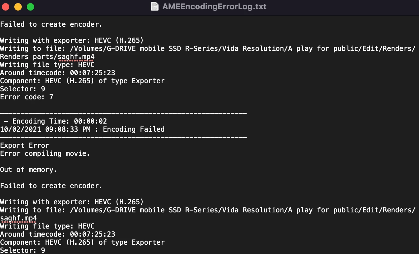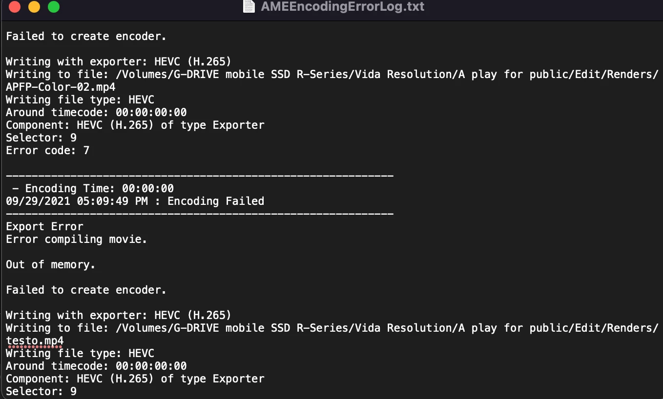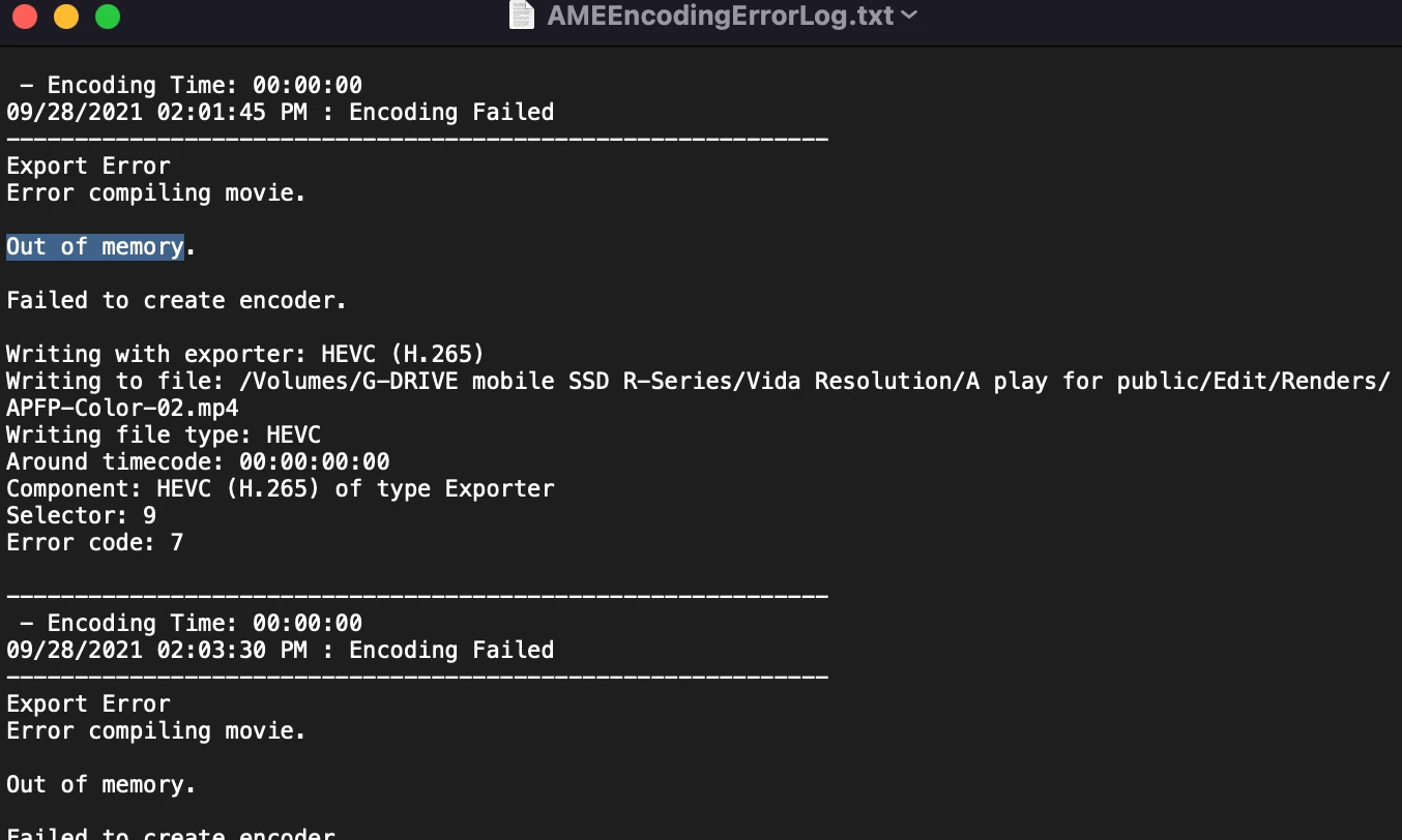 Itreid to render 20 minuts my final movie via adobe encoder in HEVC H.265 each time i got this error AME Encoding Error Log.txt Out of memory,