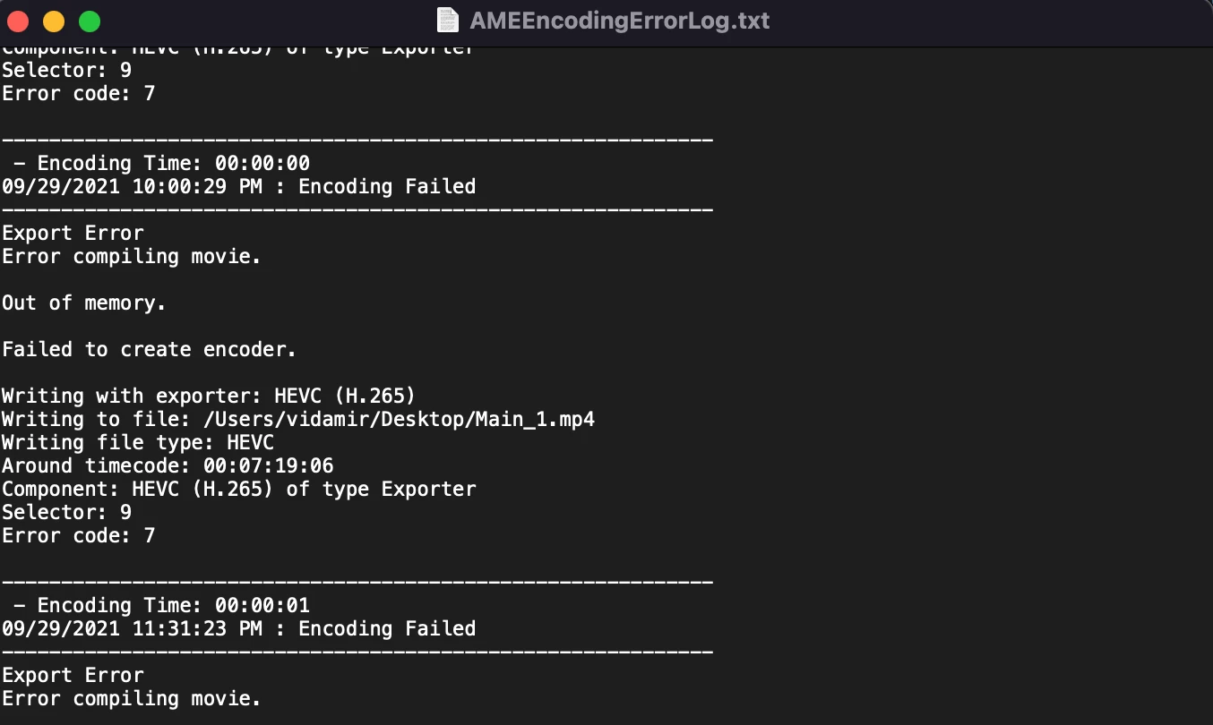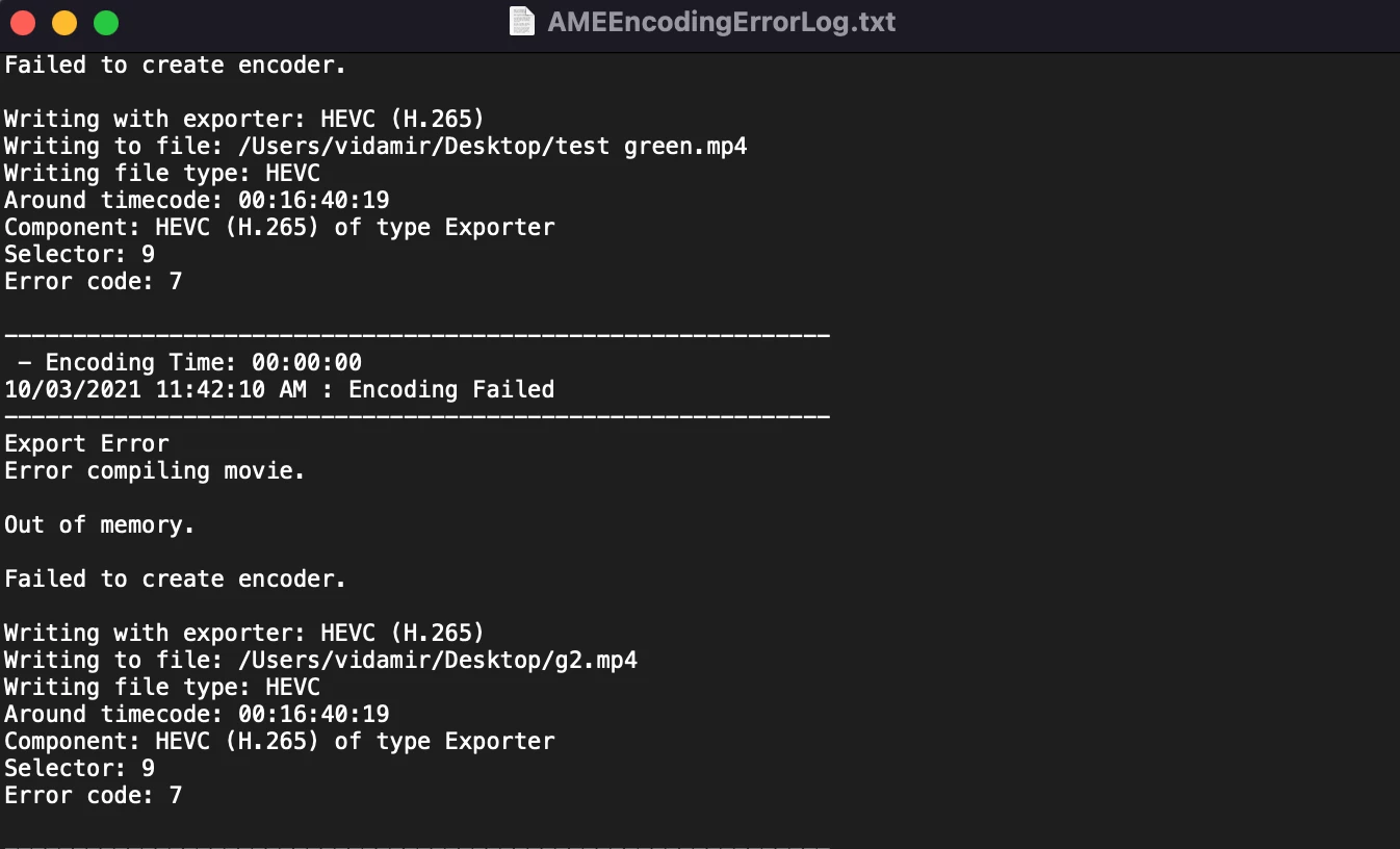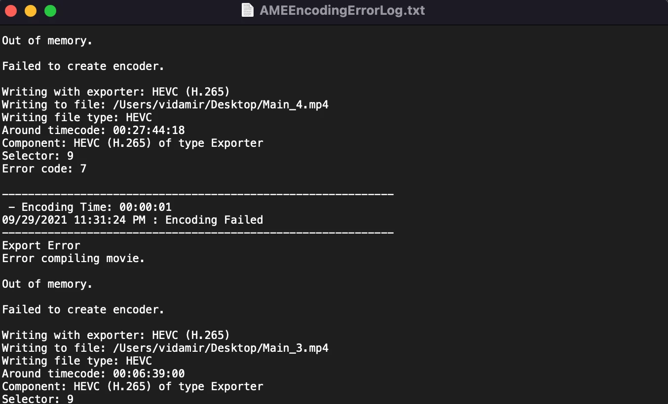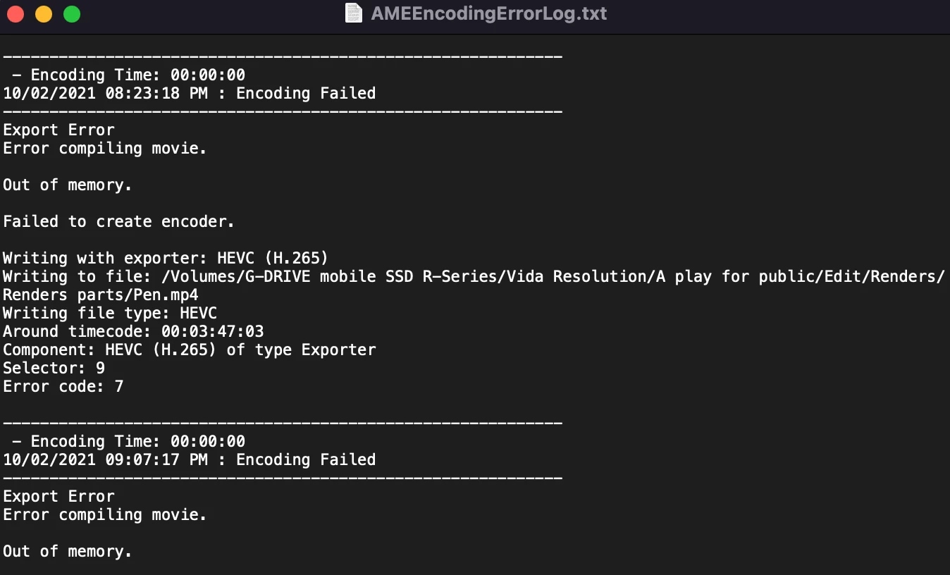 Itreid to render 20 minuts my final movie via adobe encoder in HEVC H.265 each time i got this error AME Encoding Error Log.txt Out of memory,