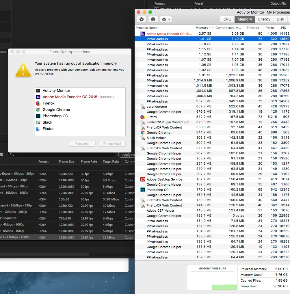 My machine did not crash last night but it locked up all other applications as well as AME due to lack of memory; freezing the queue after about 7 of 52 renders. Based on several other threads it appears that it is not terminating old PProHeadless processes which eats all of the ram - I'm not sure whether or not this is the culprit, it does look that way (I'm including a screen shot showing the PProHeadless processes on Activity Monitor).