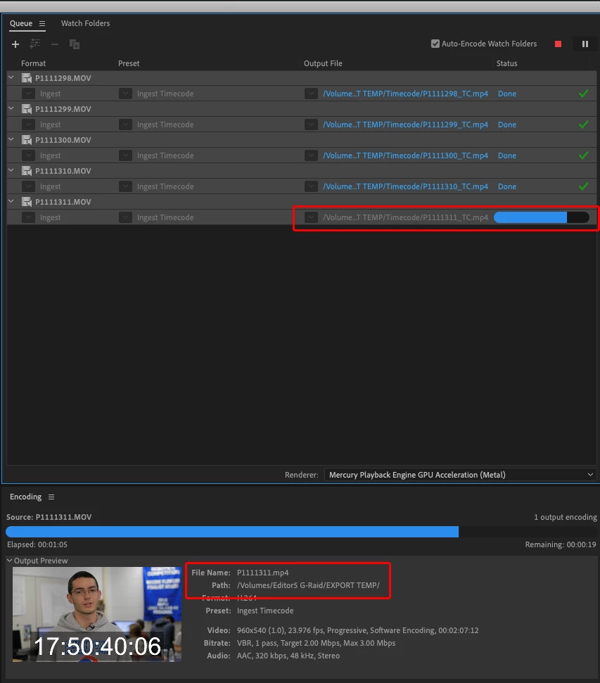 Used an Ingest preset to batch export some video files. The preset contains an output file destination along with a file renaming command, yet two of the files were exported to the default destination for Media Encoder and were not renamed. Pic demonstrating this in the act is attached.