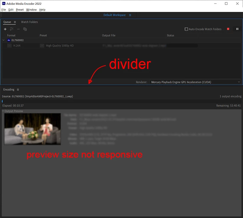 After adjusting the horizontal divider between the top and bottom area, I expect the output preview to adjust itself as well but it stays the same size.