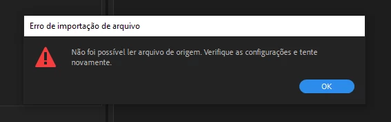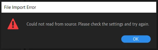 I even added to render queue > Queue in AME and it popped up in AME (Image 2) but when I clicked to change the settings of the render, appaers an error saying "Unable to read from the source. Please check the settings and try again" (Image 3).