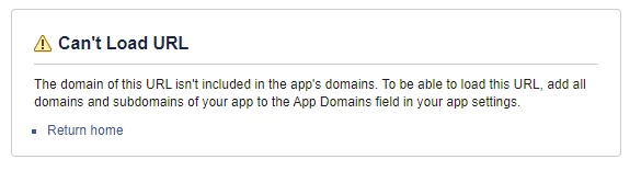 The above says "The domain of this URL isn't included in the app's domains. To be able to load this URL, add all domains and subdomains of your app to the App Domains field in your app settings."