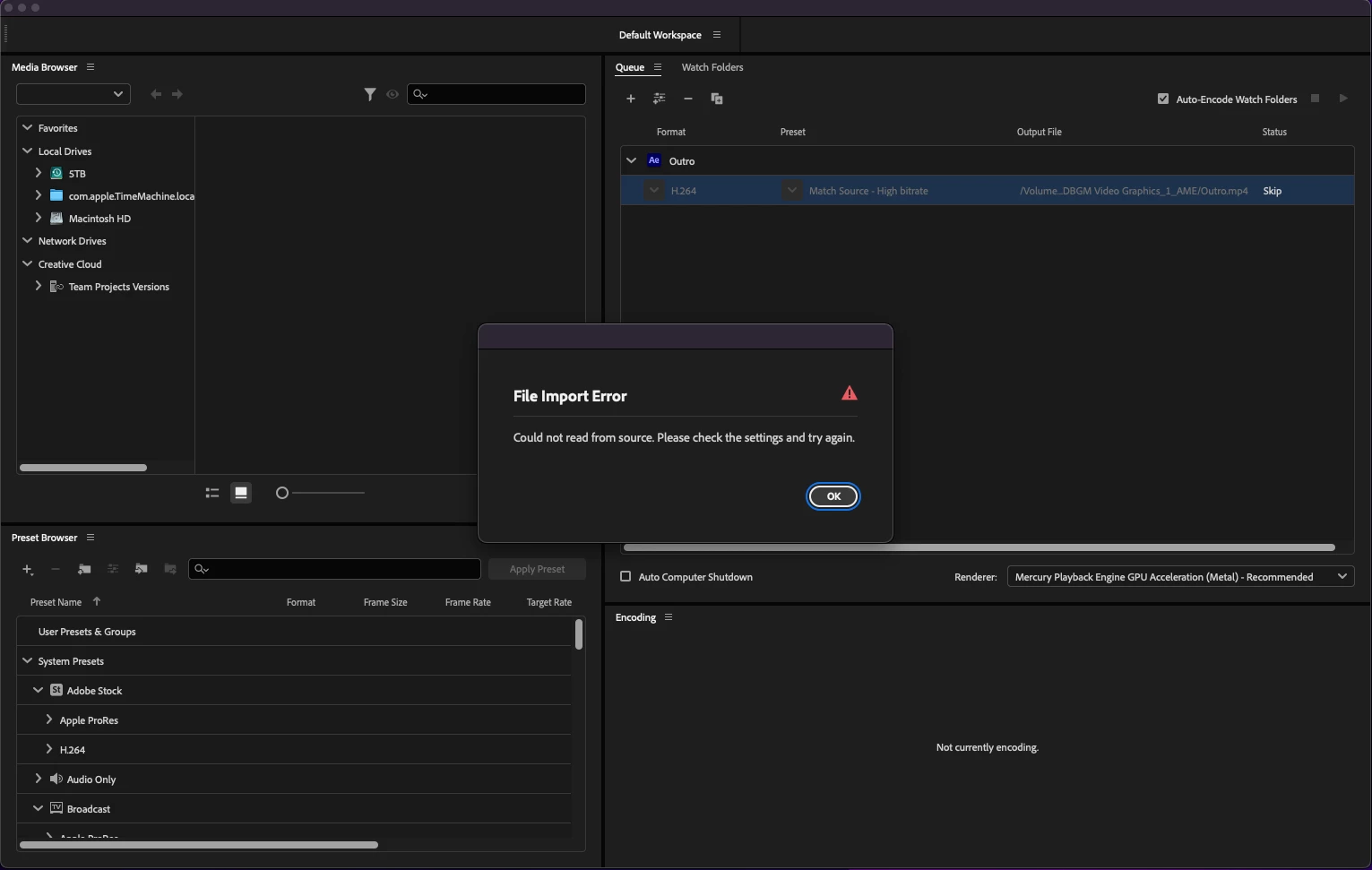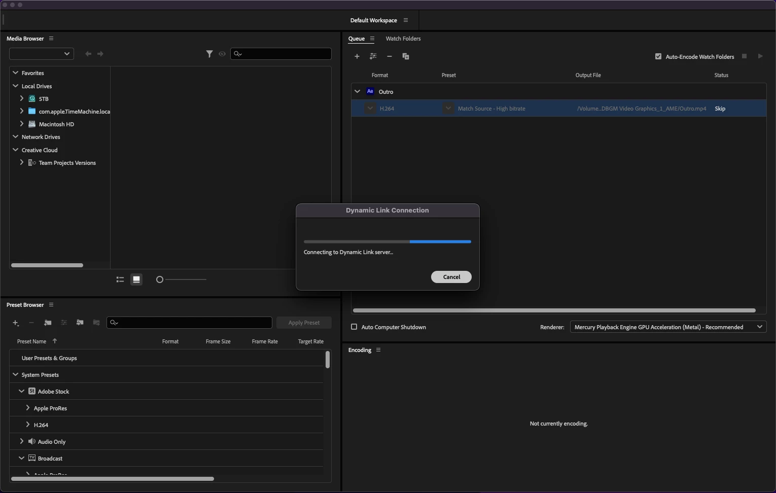I'm attempting to render a file from AE in AME, but every time I click to update "export settings", AME sits on "Connecting to Dynamic Link server" before giving me an error message. How do I get AME to connect to the Dynamic Link server? I'm using a MacBook Pro running Monterey 12.5 and AE and AME 2022.