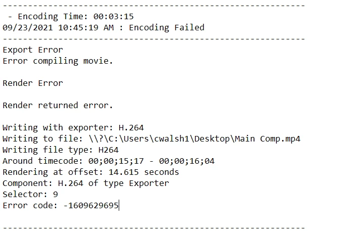 I have been trying to export a ~3:00 long After Effects project for weeks now. I've tried software encoding, hardware encoding, different computers, different distination files, all with no luck. The strange thing is I exported it successfully the first time and then went back and tweaked minor things (fonts, colors, etc) and ever since then, it can't get beyond ~:30.