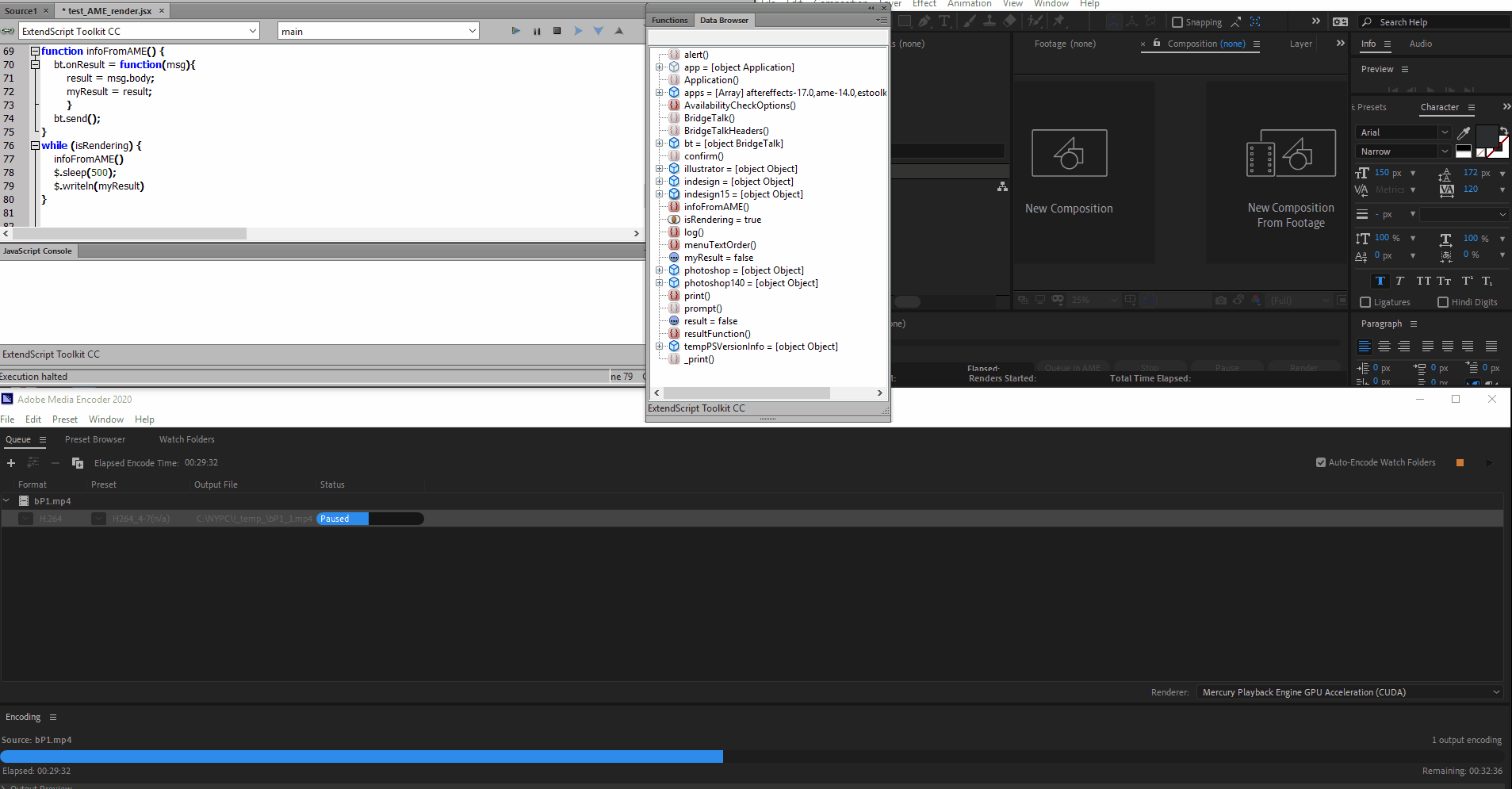 This is the code for checking if the render is done. I run it throught ESTK (After Effects) and wait when the render stops. But the problem is when I run it through ESTK (chosen ExtendScript Toolkit CC) it works fine: when the script starts, it writes true values in the console. BUT if I run it throught AE (chosen Adobe After Effects 2020) it just catch only the first "callback", only the first value of "isBatchRunning()". If I pause or stop the render, nothing happens, only the first value of "result" is displayed in the console. What am I doing wrong? Thanks!