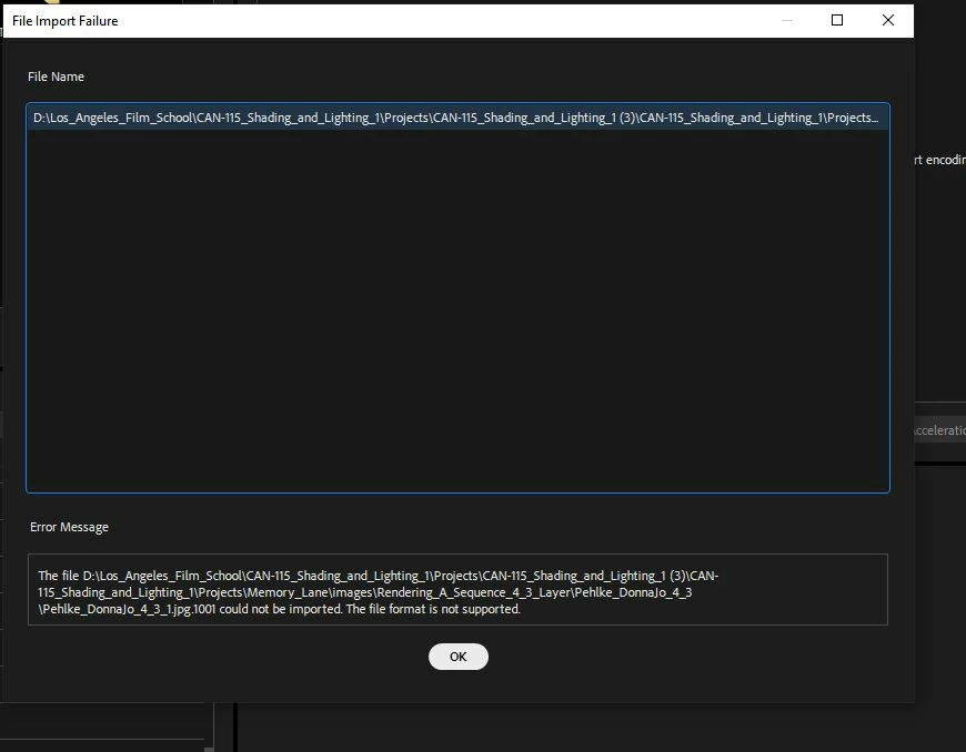 Hello, im currently working on a project for school where i have to put all these .jpg files inot one video using Media Encoder (23 edition) and i get this error message whenever i try to drag and drop a picture. I cant even see the pictures if i search for the file using the encoder. PLEASE HELP!