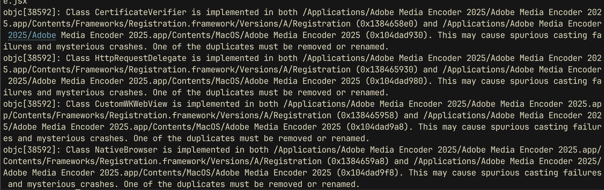 objc[38592]: Class CertificateVerifier is implemented in both /Applications/Adobe Media Encoder 2025/Adobe Media Encoder 2025.app/Contents/Frameworks/Registration.framework/Versions/A/Registration (0x1384658e0) and /Applications/Adobe Media Encoder 2025/Adobe Media Encoder 2025.app/Contents/MacOS/Adobe Media Encoder 2025 (0x104dad930). This may cause spurious casting failures and mysterious crashes. One of the duplicates must be removed or renamed.