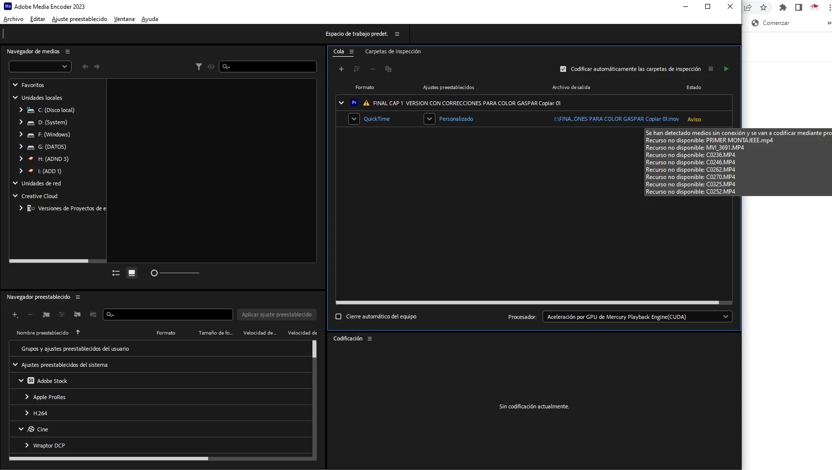 Escribo porque estoy teniendo un problema en encoder. Cuando pongo a exportar un video de premiere en encoder me sale un aviso que dice "se han detectado medios sin conexion y se van a codificar mediante proxy" , luego me muestra la lista de los archivos que se supone que estan desconectados. Cuando voy a la linea de tiempo de premiere no hay ningun archivo desconectado.