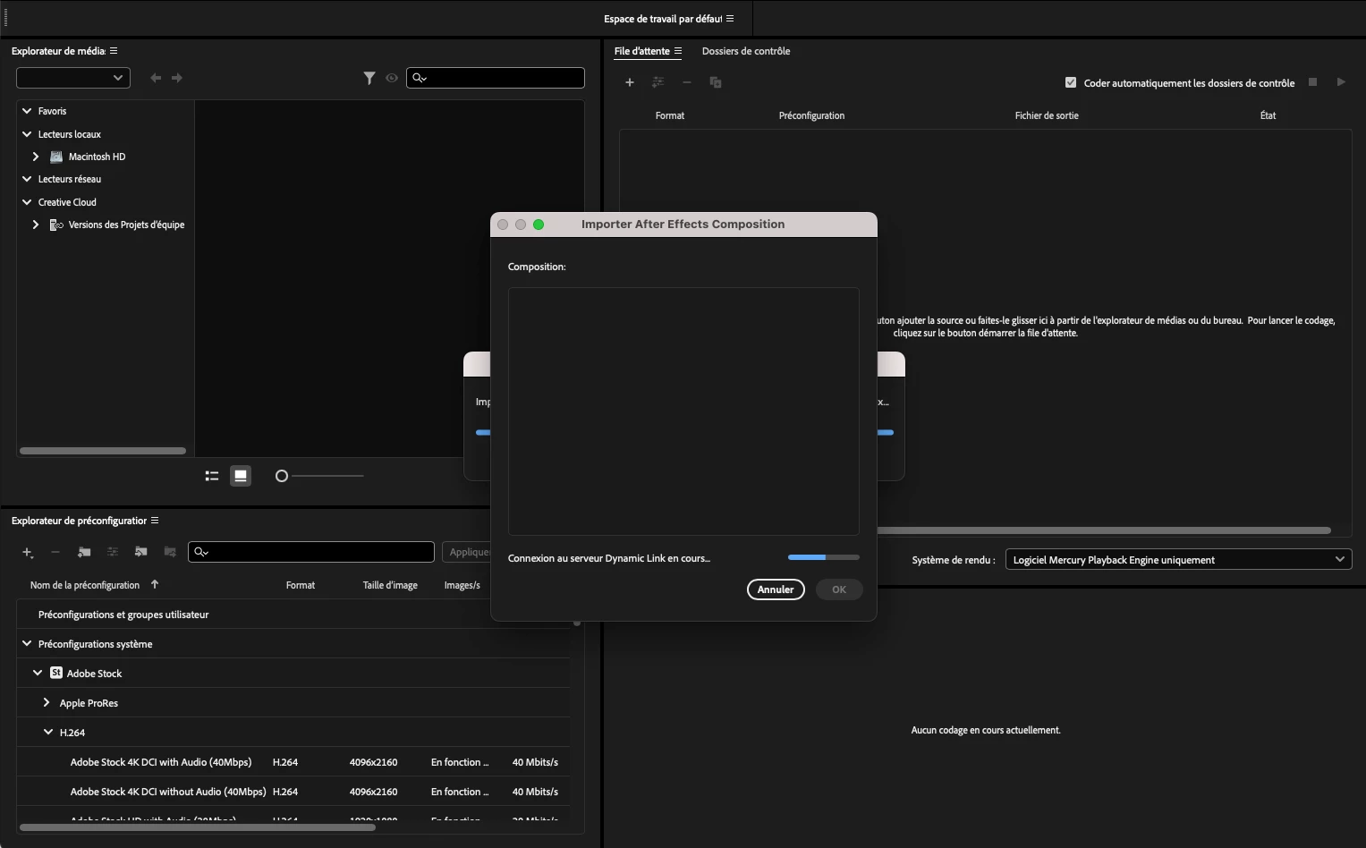 je travaille sur after effect version 24.1.0 et je ne peux plus exporter dans media encoder (version 24.1.1) mes projets. J'ai une fenetre qui mouline avec Connexion au serveur dynamic link mais il ne se passe rien.