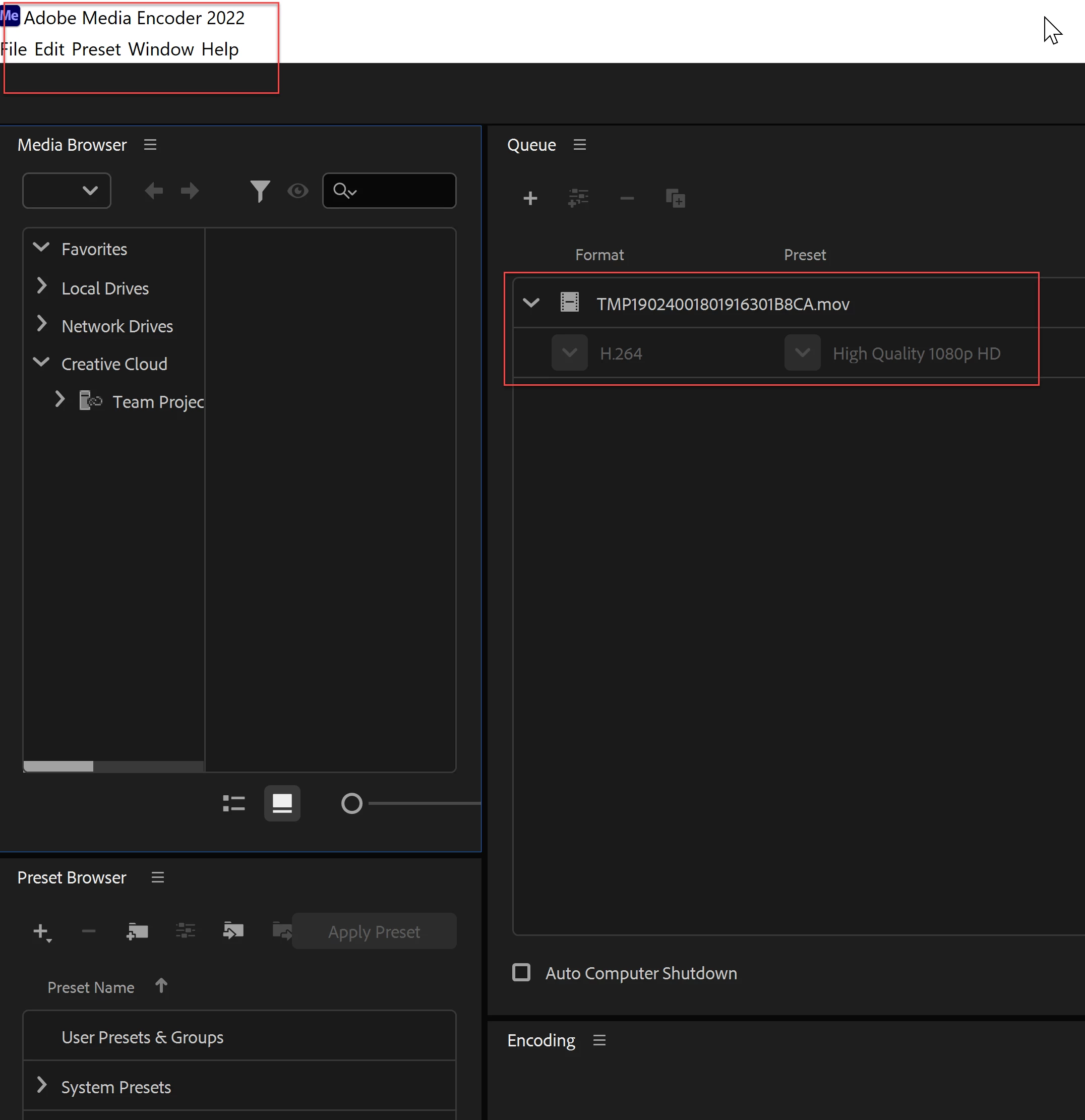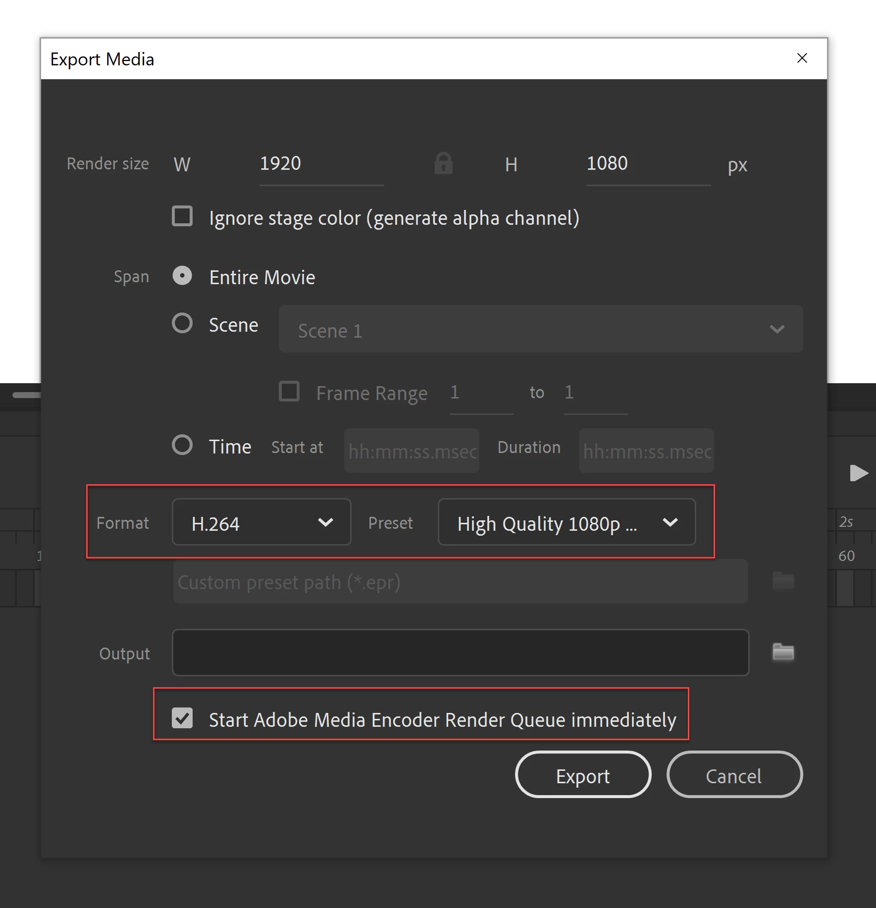 Use Format: H.264 / Preset: Default (AME) or Match Source Adaptive High Bitrate.