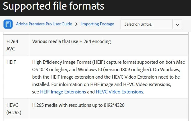 I have tried purchasing the H265 codec from the Microsoft Store as per Adobes own official user guide under supported file formats. Absolute waste of money, doesnt even work with Windows Media Player properly (I use VLC media player with K-Lite codec pack, you can use K-Lite to install H265 into media player if anyone wishes to do so without wasting money on Microsofts solution that has a slim chance of working)