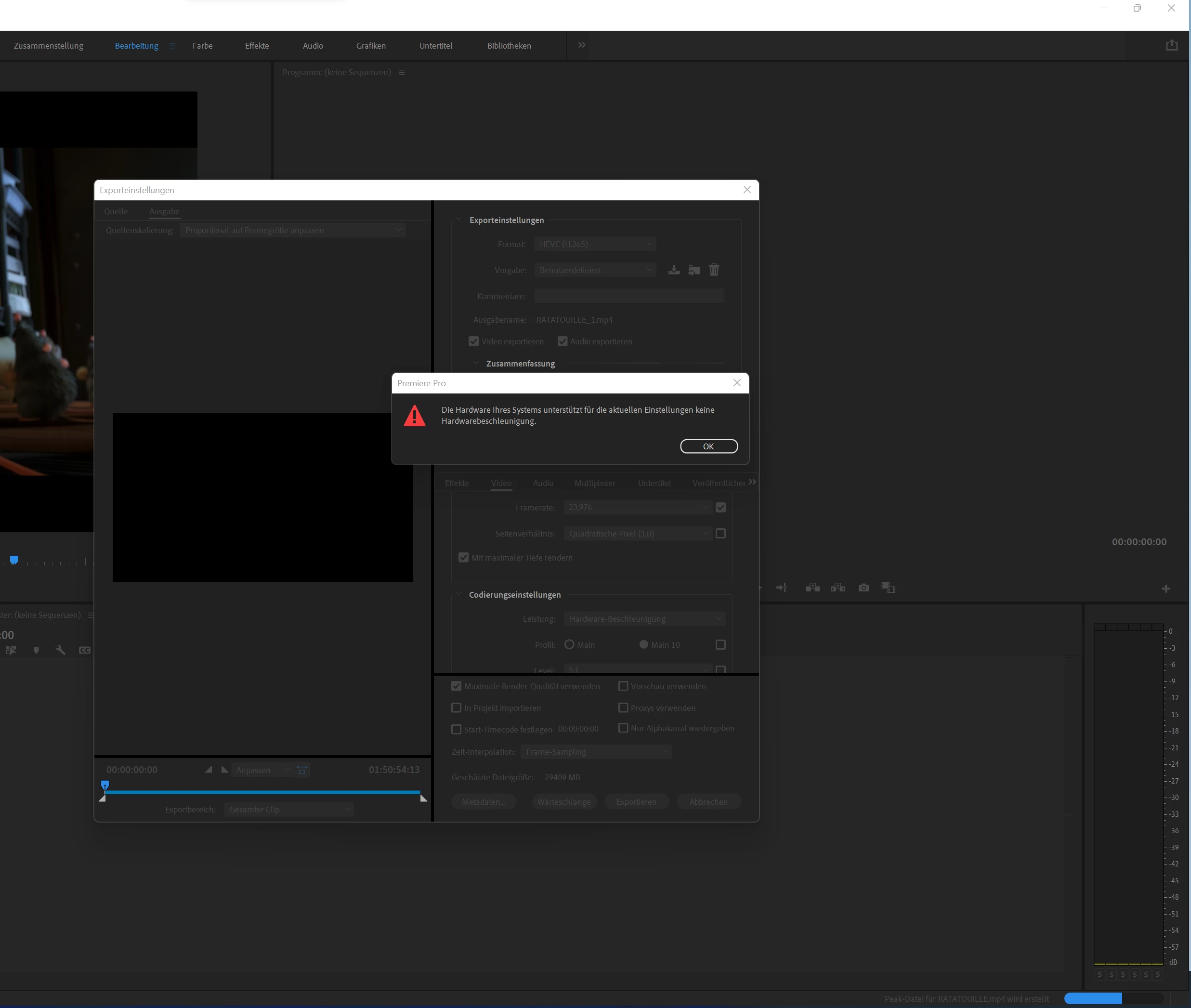 1.5 hours of GoPro video are estimated at 40 hours because hardware acceleration is not possible, as the INFO screen says.