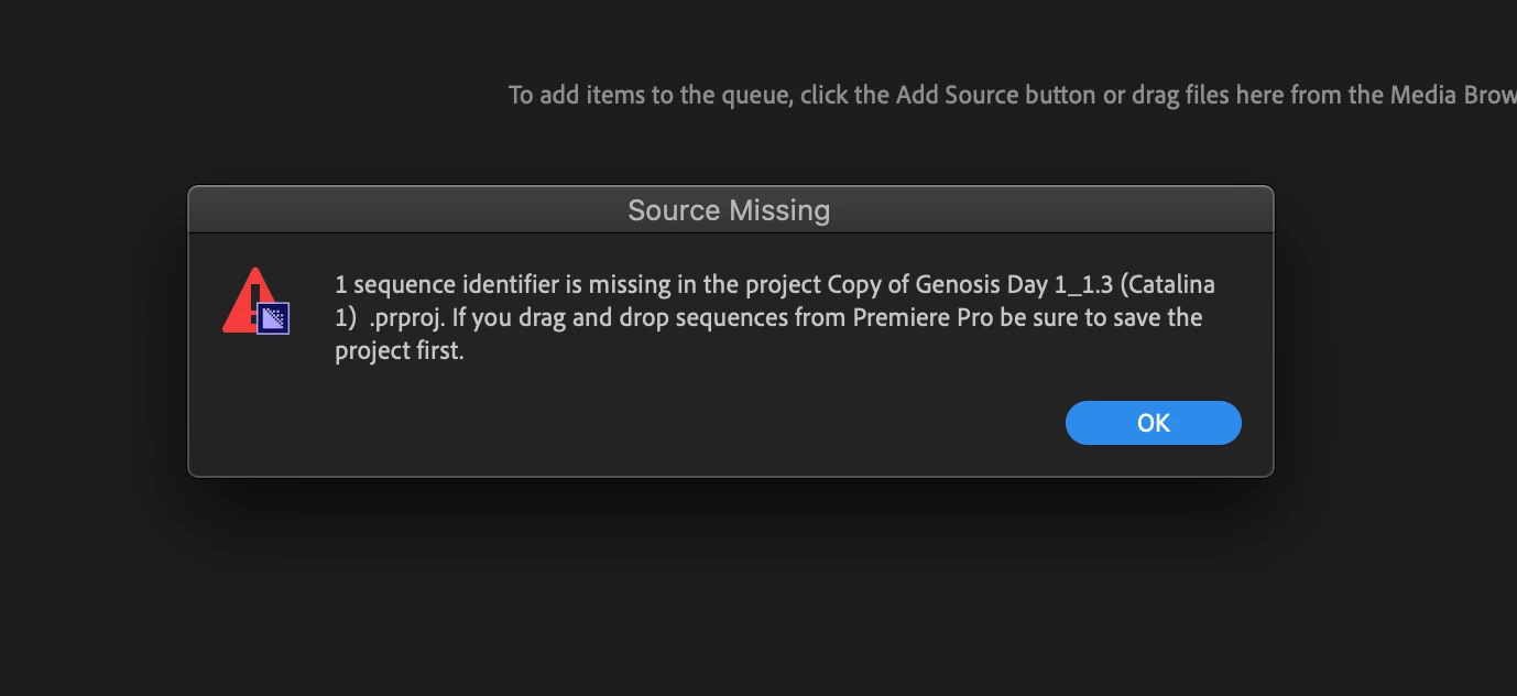 Anyone ever experienced this before? My timeline in premiere looks ok, all the files are ok. nothing is missing from the timeline or project. But I'm not sure what is this "sequence identifier" that is missing, someone help me, please. I'm nearing the delivery stage of my video project and this is the first time I've ever encounter something like this. I have 10 video output but only 6 videos were able to be rendered. The rest just prompted me the same error.