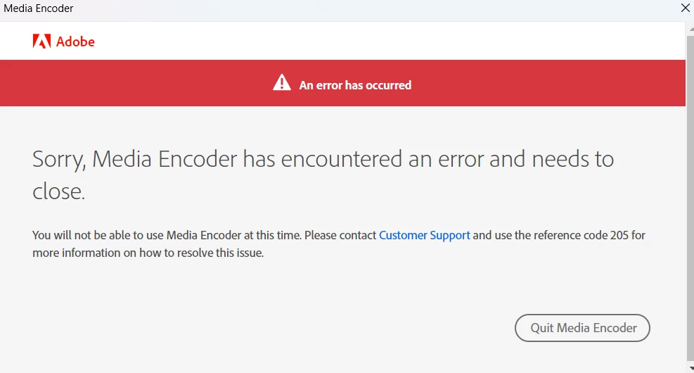 Sorry, Media Encoder has encountered an error and needs to close.