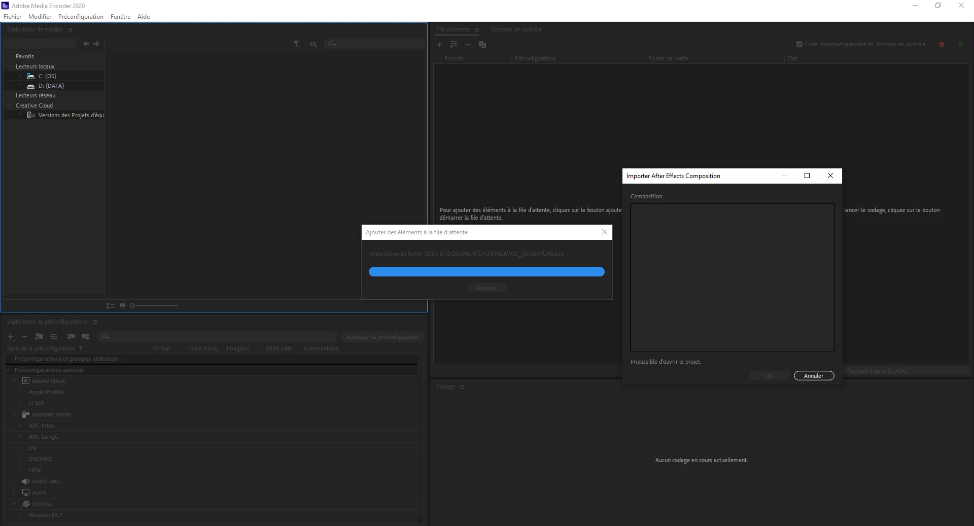 Je ré-essaye, re-démarre les logiciels, mon ordi, rien. l'ajout à la file de rendu fonctionne avec certaines composition AE, mais pas avec d'autres. J'essaye de 'louvrir manuellement depuis Media encoder mais RIEN. Il me dise "impossible d'ouvrir le projet". (cf image plus haut).