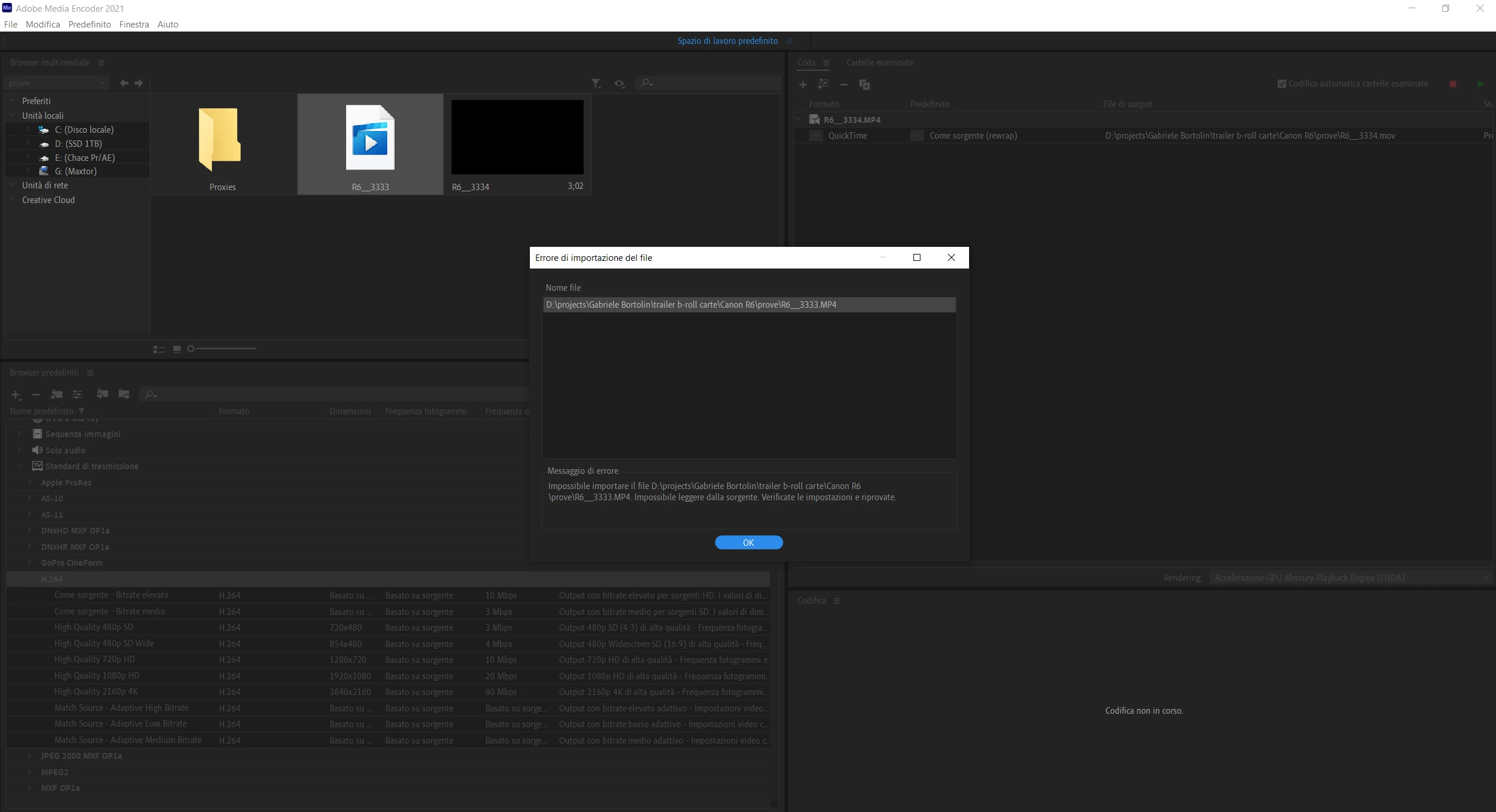 Hello there! I'm writing because I'm not able to create proxy files for my Canon R6 Log clips. The problem seems to be the fact that Media Encoder doesn't read the HECV H.265 files, infact I am not even able to import these clips inside the prgram. But if I use my second camera (whose files are H.264) to create proxies everything is fine. How do I solve this problem? Why does Media Encoder not read R6's Log clips?