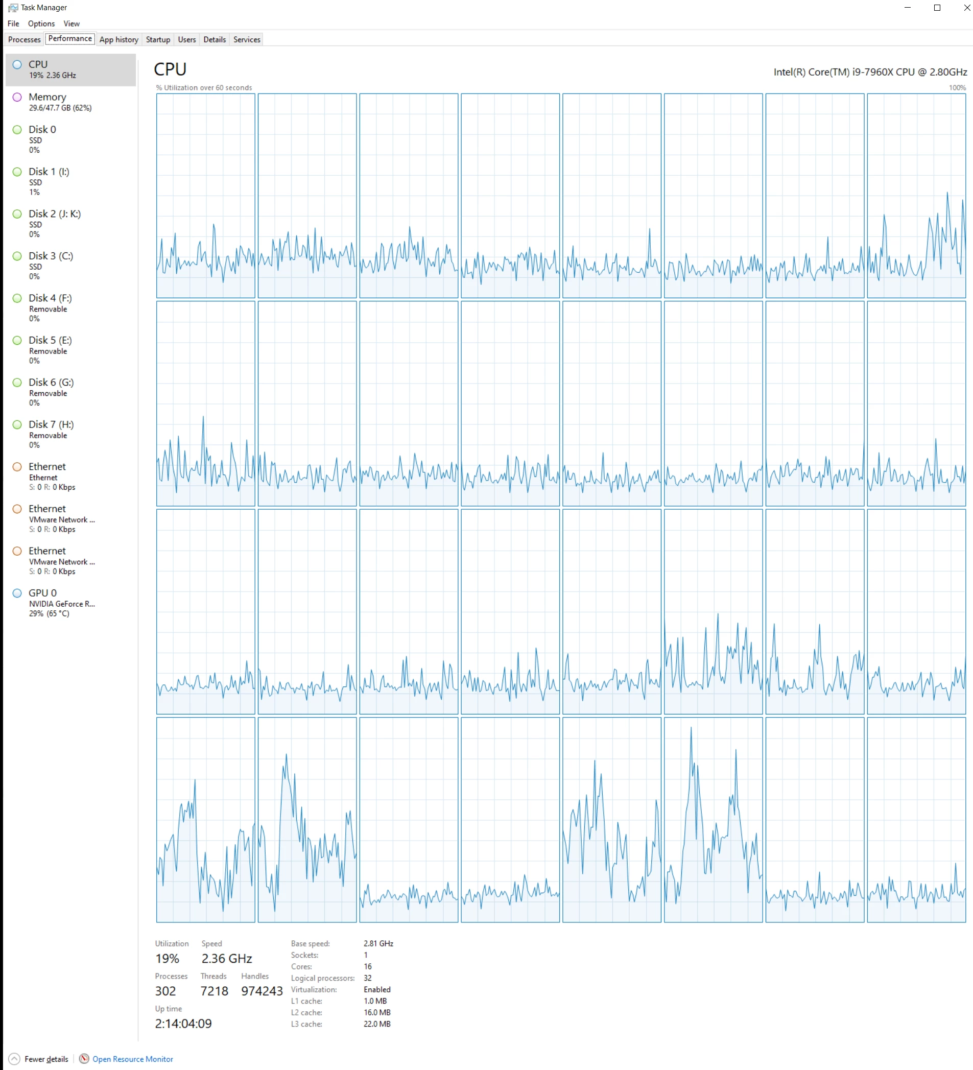 1) CPU - Intel Core I9-7960X CPU @ 2.80GHz 16 cores - 32 logical