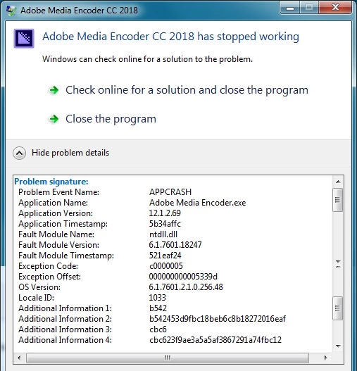 After months of successful use of Premiere and Media Encoder, Media Encoder stopped launching for me, and instead reported "The application was unable to start correctly (0xc0000005)..."  I realize Adobe doesn't want to support Windows 7 starting with its 2019 version, but I'm still running the 2018 versions; surely someone has found a fix for this.