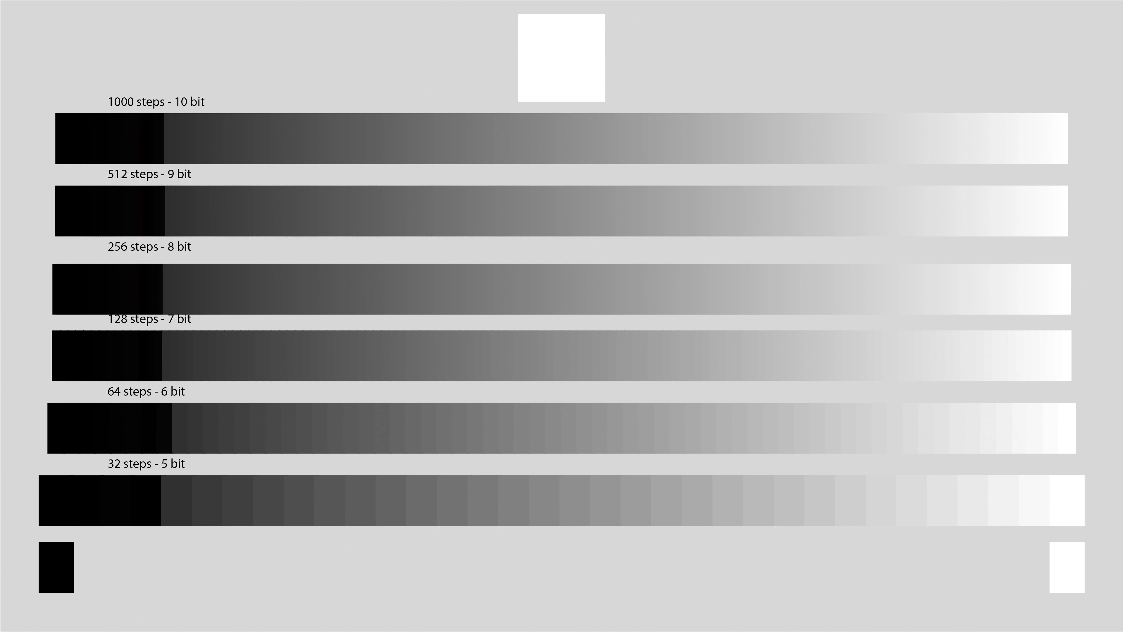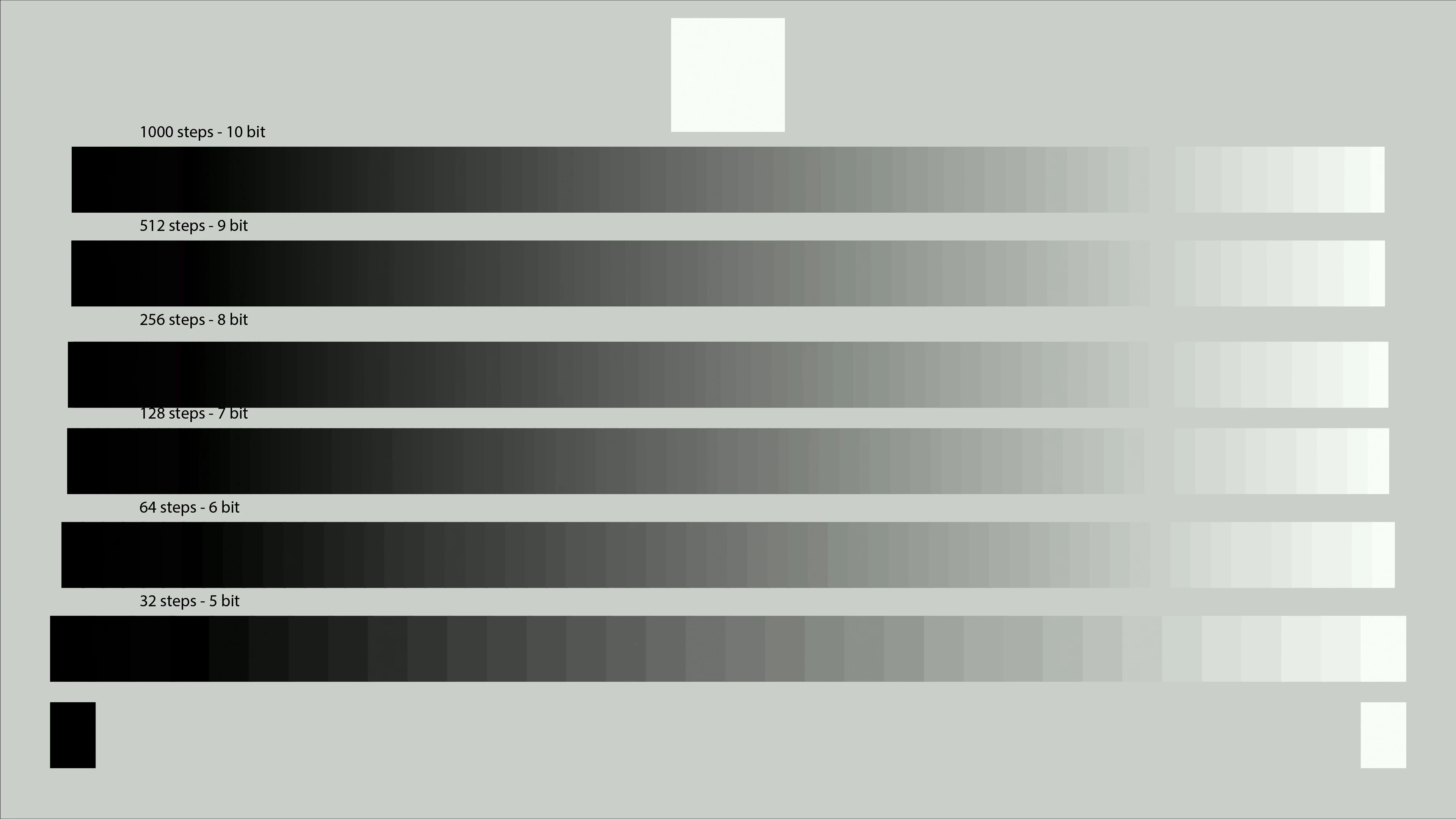 If you look carefully at the 128 steps - 7 bit bar (the one under those words), you'll see some inconsistencies - it isn't a smooth blend. There are a lot of these inconsistencies, where the width from one step to the next varies every few bars. 6 bit, with 64 steps, seems to be OK, so I'd say I'm getting between 6 and 7 bits of detail out of this.