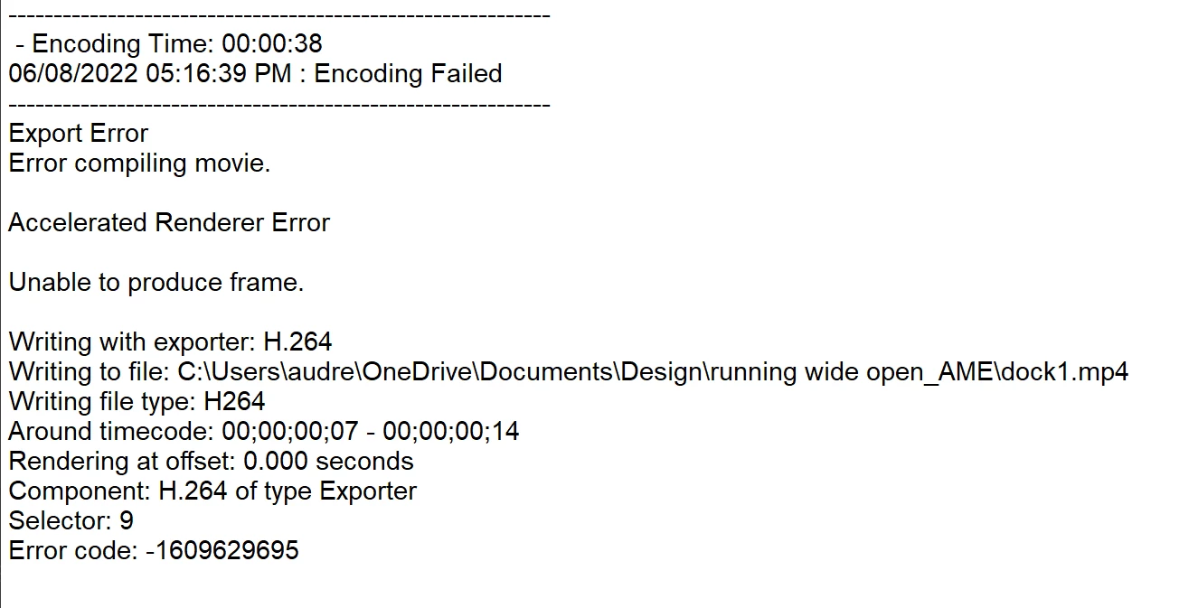Today when I was trying to export an mp4 from After Effects, Media Encoder kept failing to export. I tried it on all 3 settings (cuda, opencl, and no acceleration) and it all gave me the same problem. I tried exporting it as a quicktime but it also failed. My After Effects file is very simple and I don't think it has anything that should be causing issues. I've never had this problem before. I attatched a picture of the error message I'm getting.