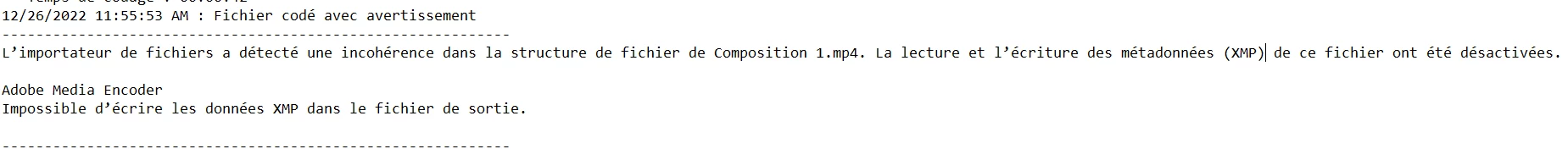 Bonjour, Lorsque j'exporte une vidéo dans Media Encoder au format H264, je n'arrive pas à lire la vidéo et je vois qu'il est indiqué la lecture et l'écriture des métadonnées ont été désactivées et Impossible d'écrire les données XMP dans la fichier de sortie, je n'arrive pas à les réactiver, cela vous ets déjà arrivé ?
