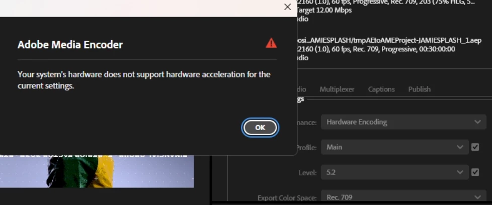 The project duration is quite long at 20-30 minutes, the first 15 - 30 seconds are quite effect intensive but then loop repeatedly for the remainder of the duration. During the first 15-30 seconds of effects the CPU goes closer to 100% (around 70-90%) but after that trickels down to barely 50%. GPU sporadically spikes to about 40% but mostly stays at very low utilization anywhere from 10 - 25%. Memory is stable at arund 42-45%. I do not use aftereffects often but use premiere pro a lot more. I notice rendering premiere pro projects is infinitely faster and takes a fraction of the time AfterFX projects take. I'm wondering why AME refuses to utilize the full power of my machine to speed up these renders. A 30 minute export takes over 3 hours. I am aware I can just render the first 2 minute long section and then loop stitch together a loop in Premiere Pro and render that and it would probably be much faster, however I'm more worried about AfterFX behaviour. That would be a less than ideal workflow. Specs are below. I feel like this system should be rendering a project like this much faster. Rendering directly in AfterFX is even longer at around 5 hours which is absurd. I am encoding 4k 60fps h264 at 12mbps CBR (this is what the AV company requested to be played on LED event screens). Important to note Hradware encoding is enabled in the encoding window of Media Encoder however Software Encoding is selected in the Encoding settings in the Export settings window with no option of switching to Hardware, met with the attached error when I attempt to switch the drop down menu. I did some research about this and came to the conclusion that the 14900k doesn't have QuickSync. However a lot of people have said this setting should not account for such a dramatic performance drop off. Any and all insight would be greatly appreciated.