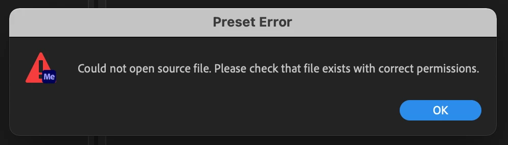I don't use Media Encoder much, but lately, every time I export a video from Animate, I get this Preset Error when Media Encoder launches. I don't know what source file it's trying to open. After I dismiss the error, my Animate file encodes as expected.