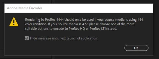 JJoe5FAAParticipantForum|Forum|5 years agoOctober 7, 2020QuestionProRes4444 warningForum|Forum|5 years agoOctober 7, 20200 replies169 viewsHow do I stop the Media Encoder warning for ProRes4444? I NEED TO USE PRORES4444 THANKS FOR THE FIRST WARNING. DO NOT NEED IT EVERY TIME.Formats