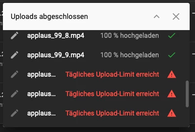 I have reached an upload limitation after 100 automated uploads in Media Encoder to youtube.