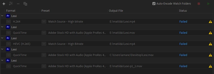 Media Encoder refuses to render this premier pro project. The first attempt was interrupted by the following