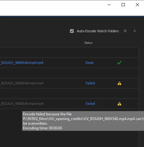 I've got a process using PP + AME that is ALMOST ideal for me. But there's one detail that requires an "O(n)" effort task, meaning the time & effort are linearly proportional to the number of files created. Bugger! When I make subclips from In & Out points PP appends "Subclipxxx" to the end of the name. When AME receives all of the subclips for rendering, it defaults to a filename with the "Subclipxxx" suffix stripped off and replaced with ".mp4". Now that all of the output filenames, by default, are identical, all of the renders but the first will fail! (screenshot below)