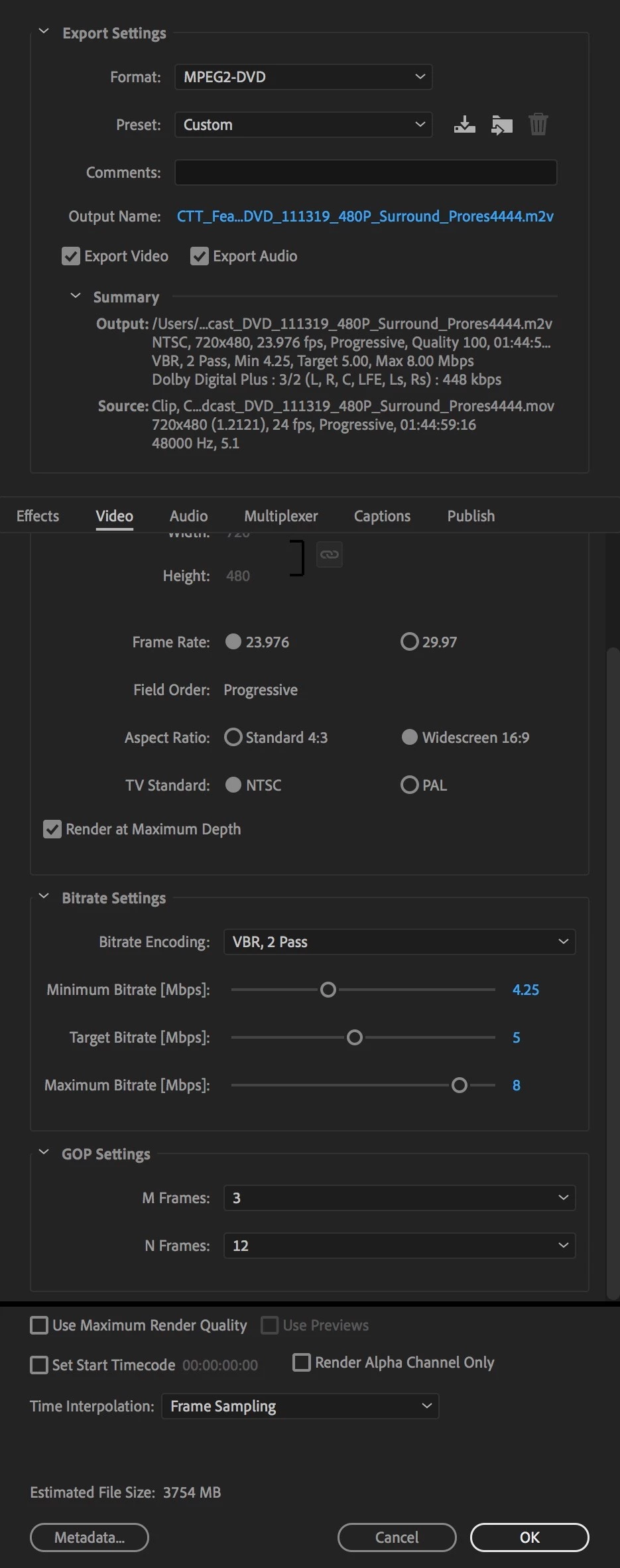 The subject line kinda sasy it all: I'm trying to encode a Prores4444 720x480 Quicktime from 24 fps to 23.976 fps in Adobe Media Encoder 2019 (13.1.5) for an m2v for DVD but getting dropped frames on playback. The dropped frames seem to happen (noticeably) at the same three places, no matter whether it's a VBR or CBR encode and whatever settings. In all other respects I'm happy with the quality but I can't get past this issue. It's so weird. I've even sucked the Quicktime source into Premiere Pro and exported from there without a problem. I'm attaching my encode settings for reference.