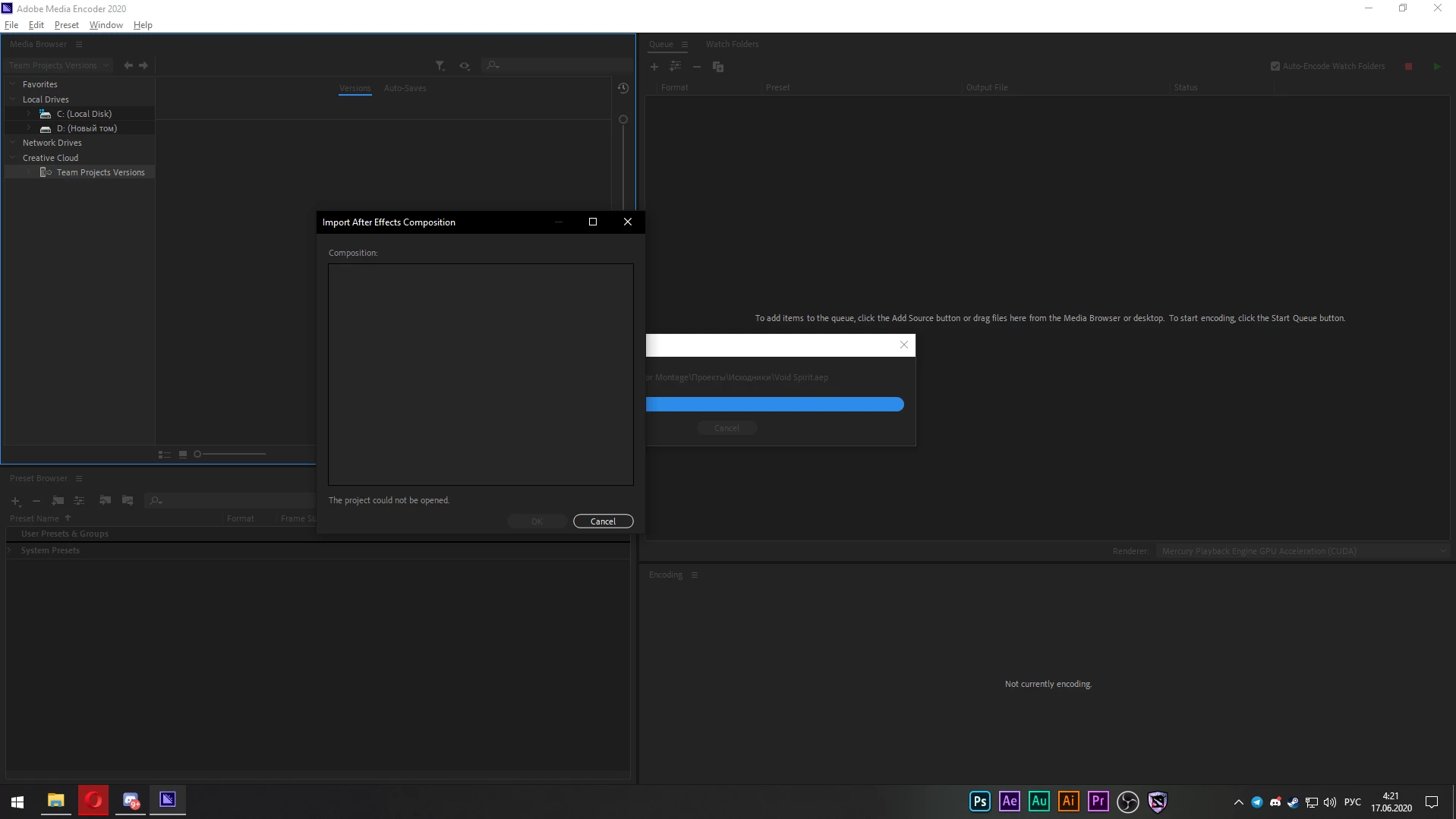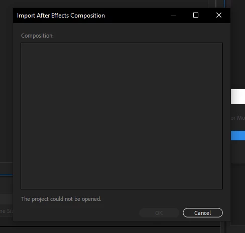 When I mounted a video in After Effects, I try to render it in AME, after which I get an "The project could not be opened" error.It works with half of the projects, some quietly opens and renders, and some do not want to open!