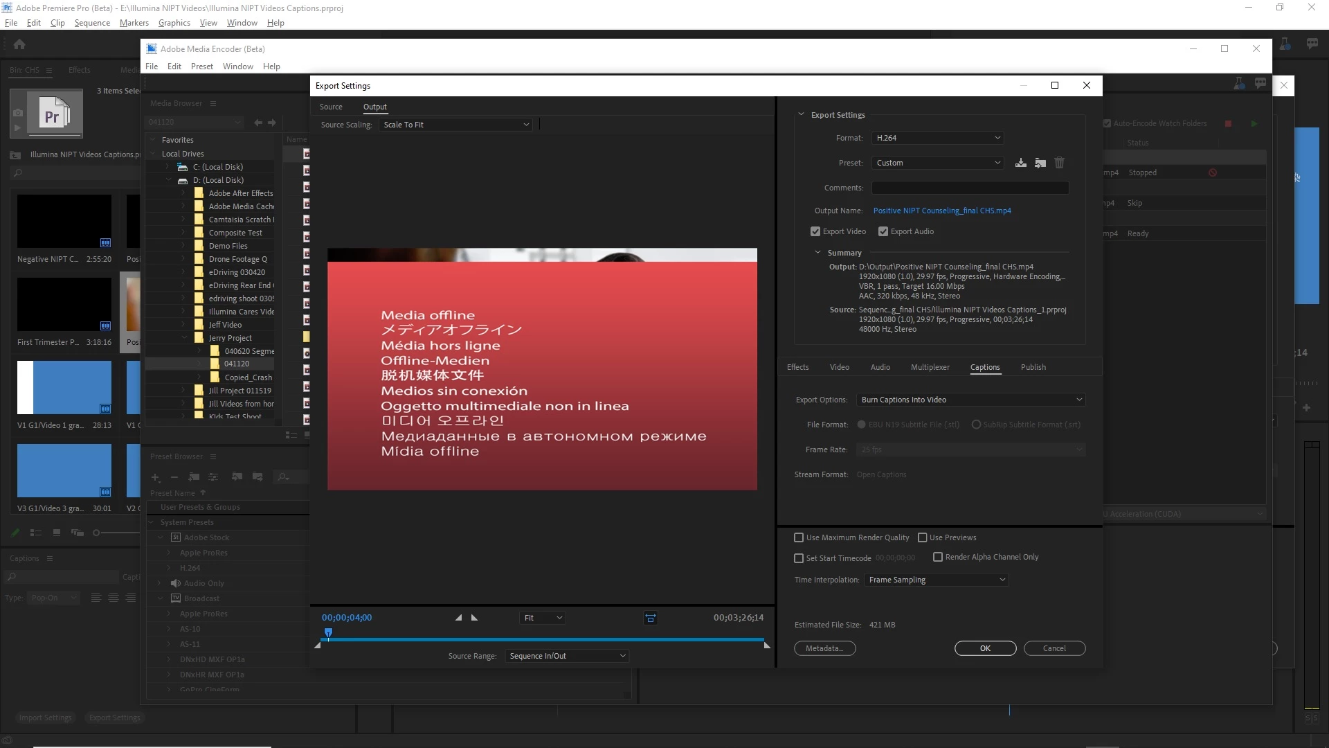 Downloaded the latest beta drop of AME, and when trying to export a file out with burned in captions in AME, the media offline graphic comes up. It exports fine directly out of Premiere, but not AME.