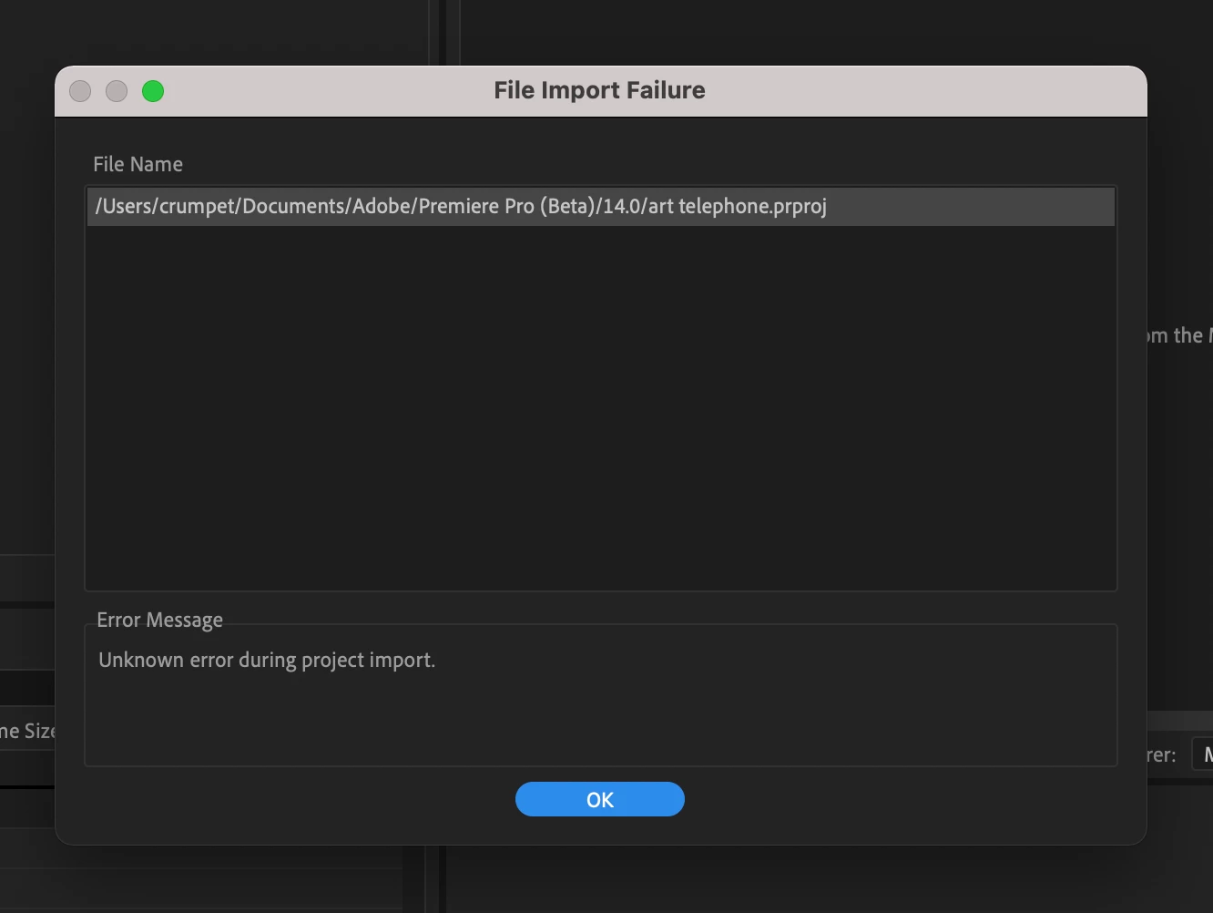 Can't add or open Premiere file at all in Media Encoder