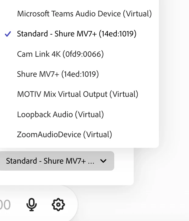Adobe Studio does not recognize my Shure MV7+ microphone (Also MicCheck)