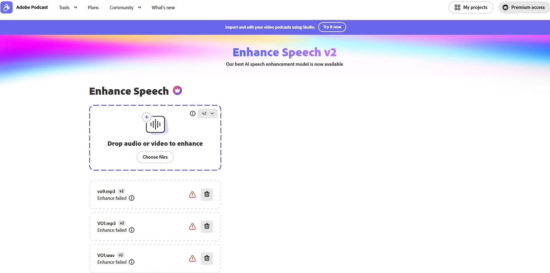 Hi @NateC001, is this happening with a specific files, or all files you upload to Enhance Speech? Can you share of the files that is failing? Feel free to email me directly at hjiroudek@adobe.com