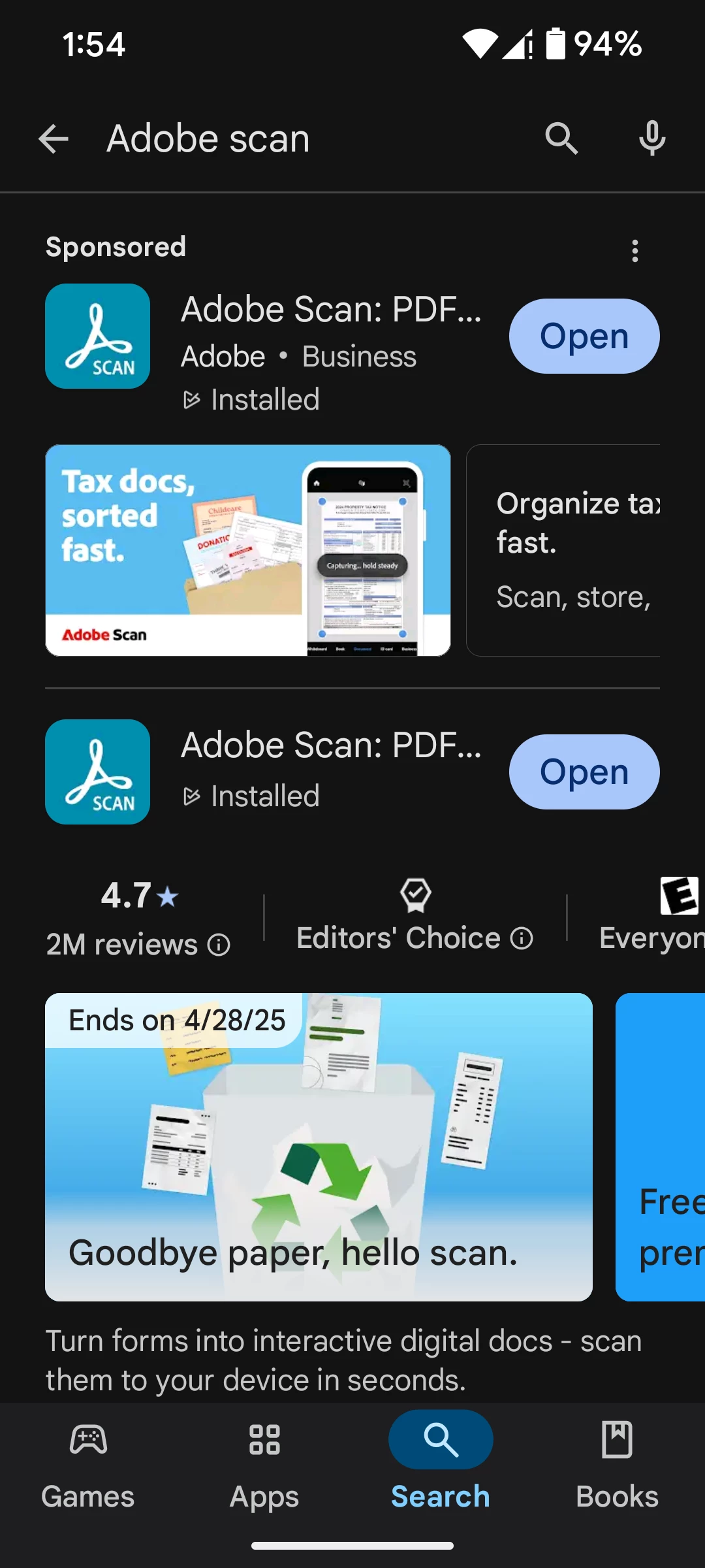 Also, maybe your Google Play Stor version is out of date? Outdated versions can sometimes cause compatibility issues with newer apps. To do this, open the Play Store app, tap your profile icon, go to "Settings," then "About," and tap "Update Play Store." After updating, restart your phone and try downloading Adobe Scan again. If this doesn't work, try clearing the cache and data of the Play Store app in your phone's settings under "Apps" or "App Management," then restart and try the download. Always restart