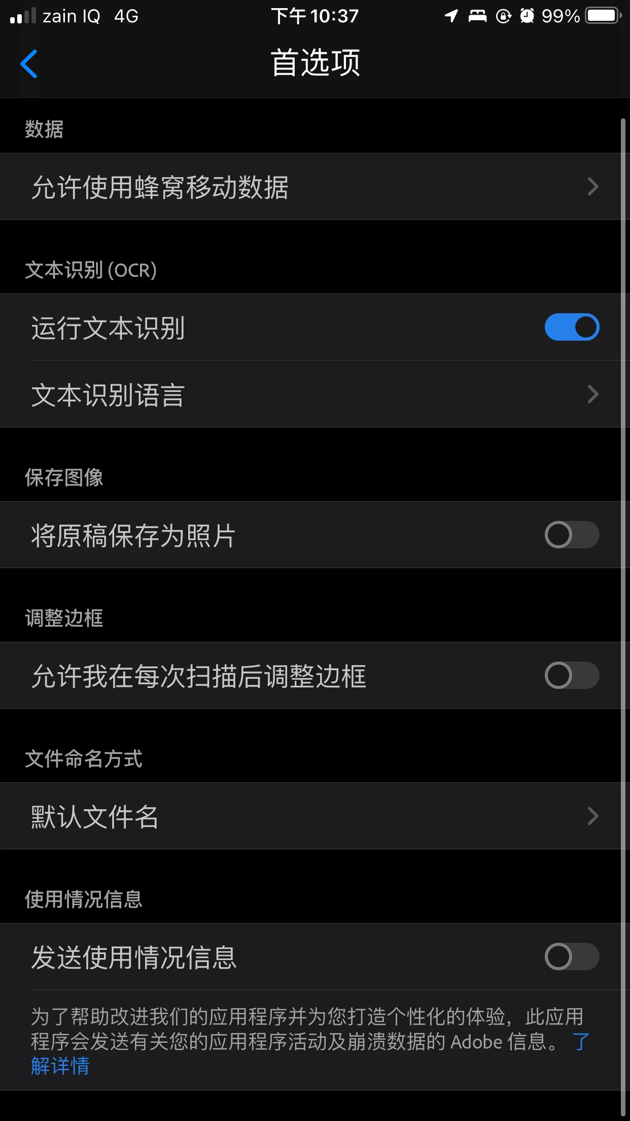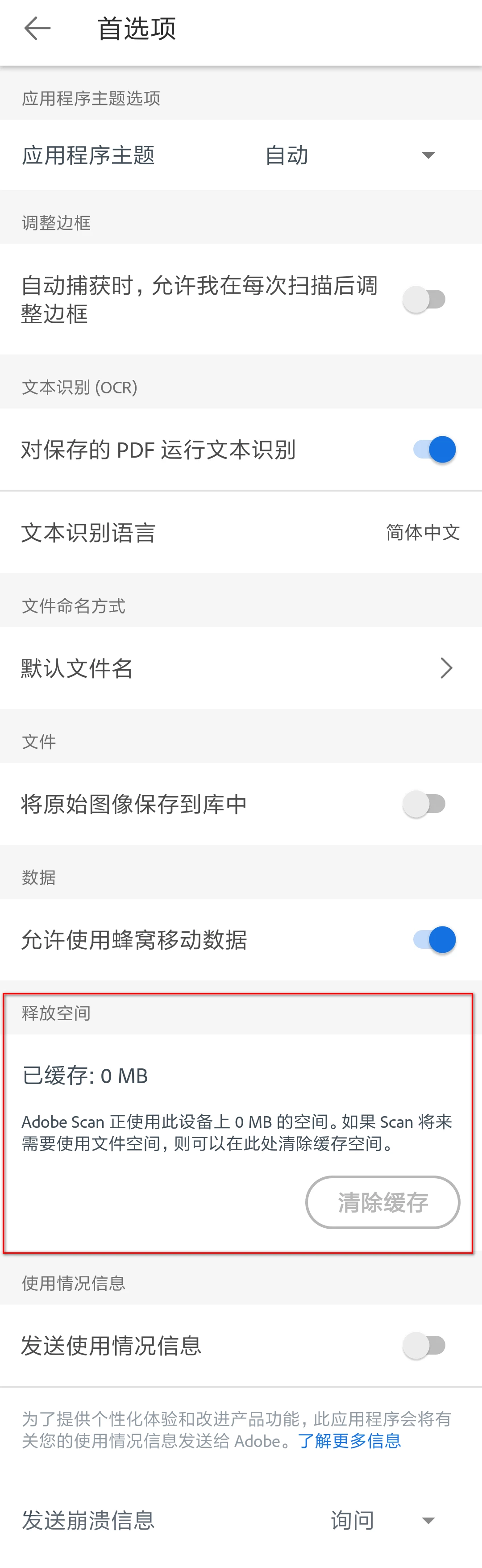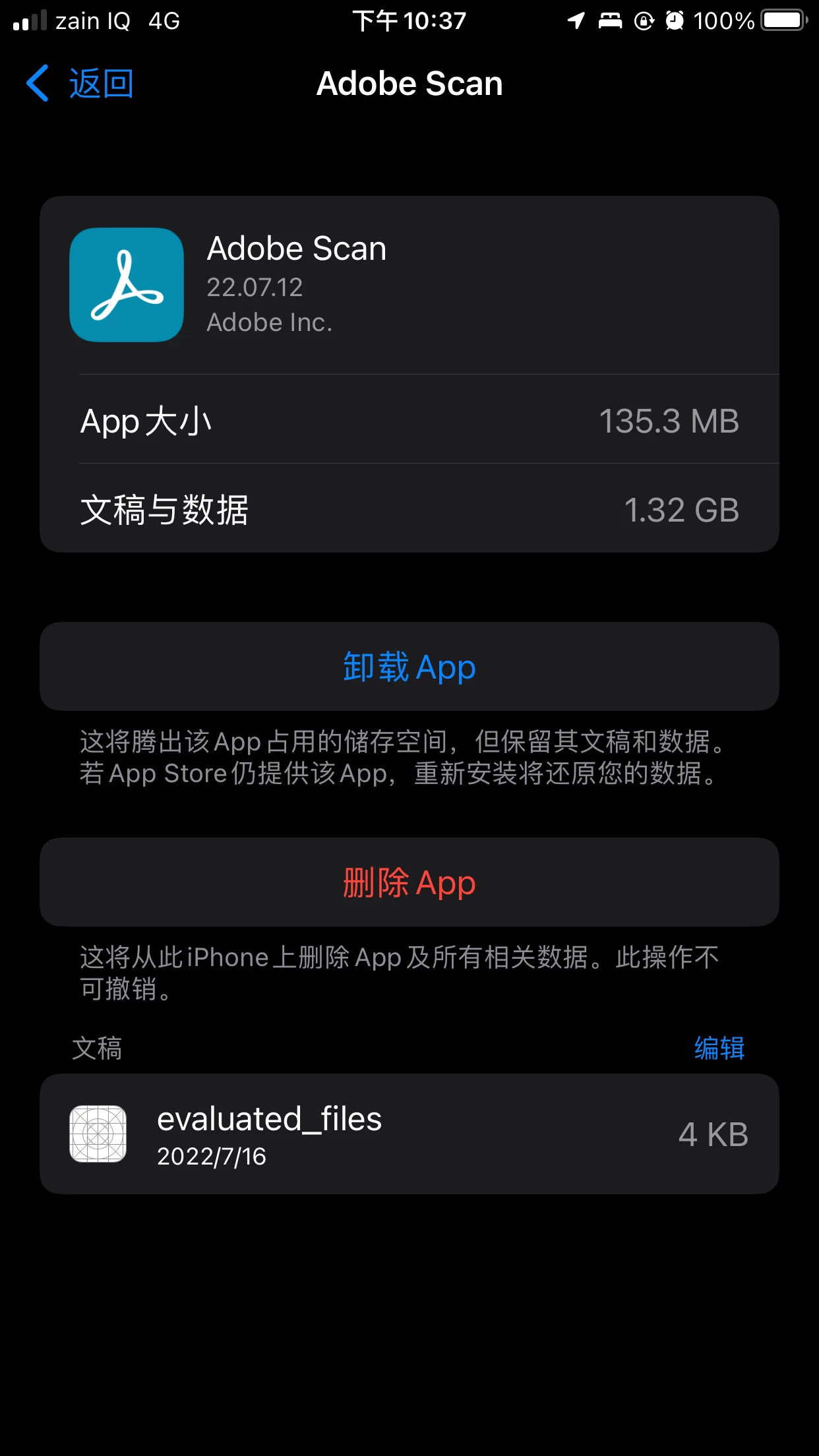 如图,我的Adobe Scan中的“文稿与数据”已经占用了1.32GB的空间,之前拍摄的文档大部分都已经在软件中删除了,目前只剩12个文档。我没有在软件中找到清除缓存的位置,请问IOS版的Adobe Scan如何清除“文稿与数据”的缓存?