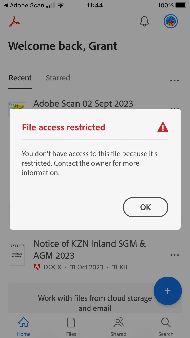 3: restricted access when choosing to open the file in acrobat from Adobe Scan.