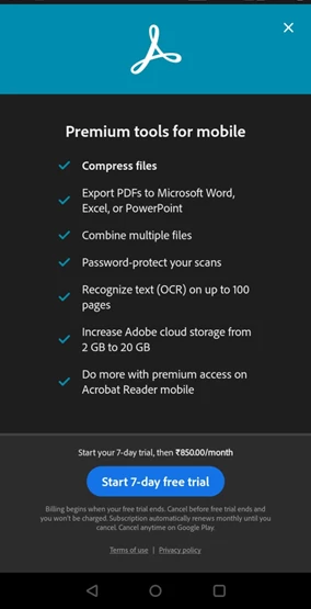 I am a bit confused after looking at the subscription plan screen for Adobe Scan on mobile.