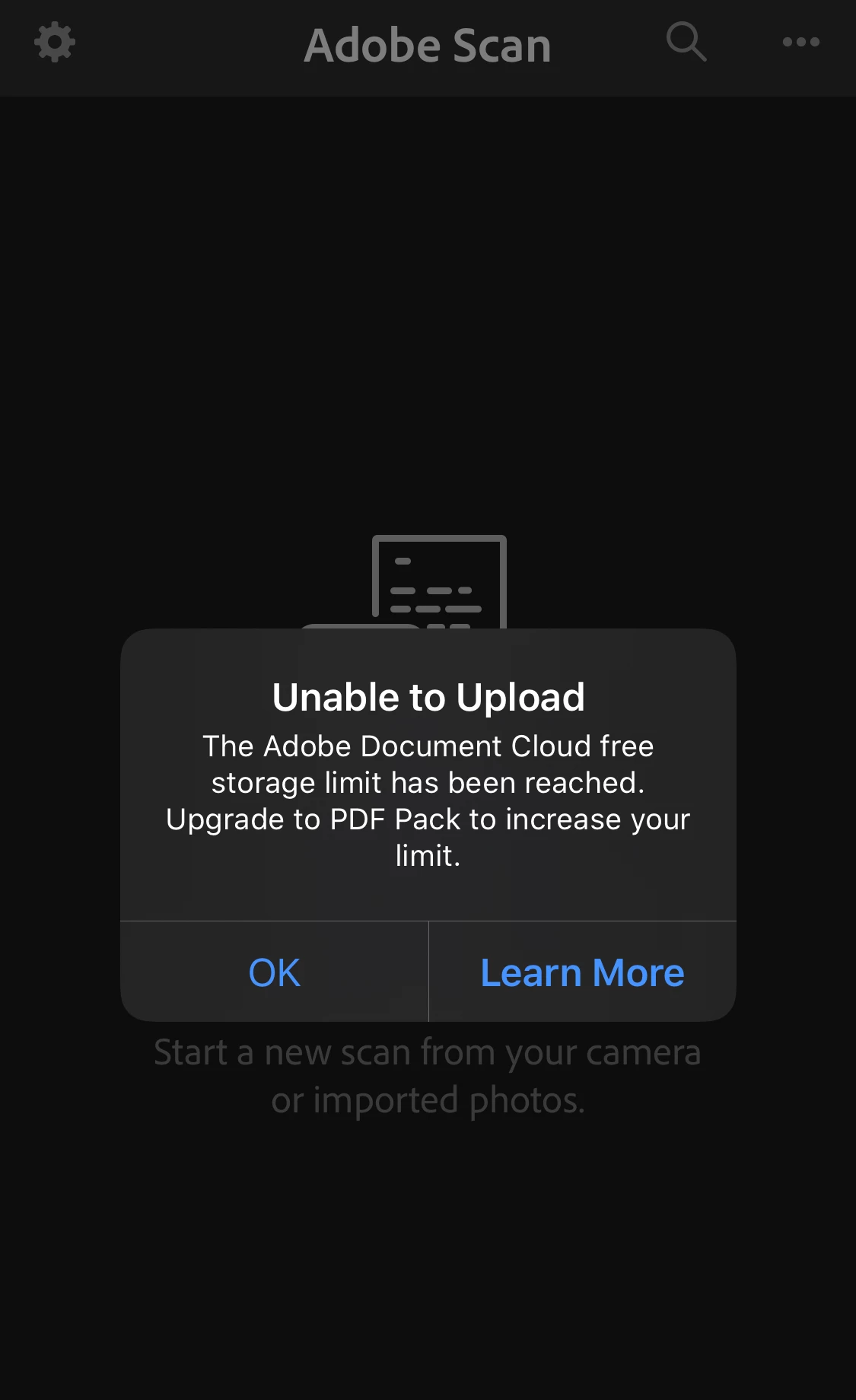 The Adobe Scan app does not upload documents to document cloud. It says I need to upgrade to PDF Pack because the Adobe Document Cloud free storage limit has been reached but I'm already subscribed to Adobe PDF Pack but it still refuses to save scans.