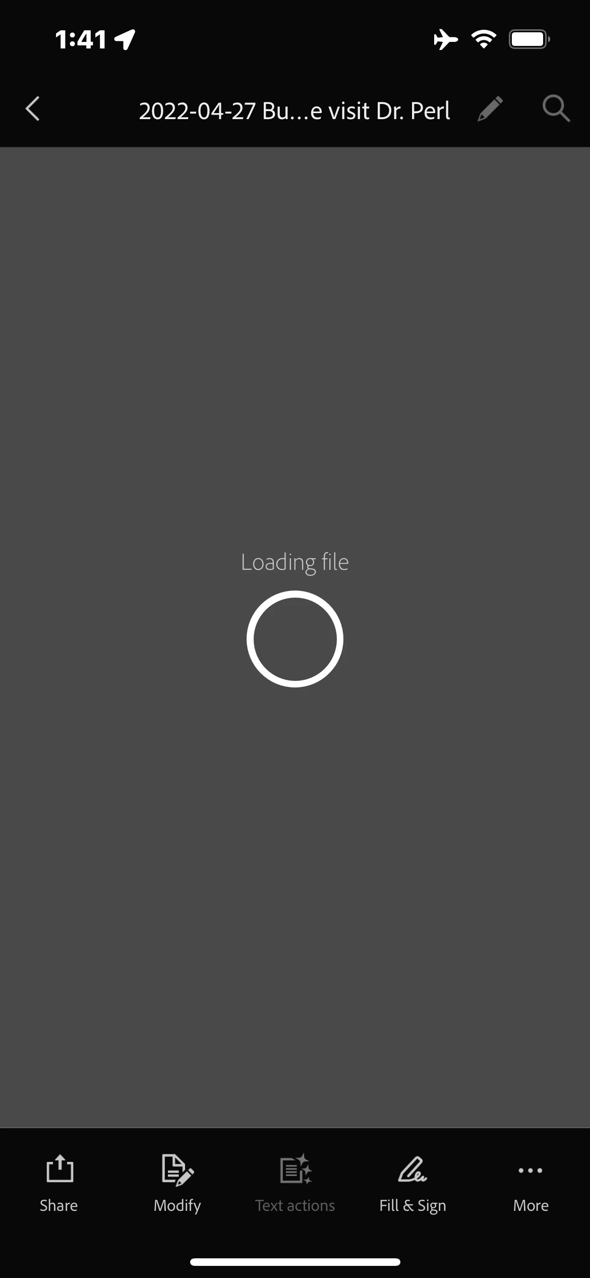 Latest iPhone version of Adobe Scan just says "Loading File" with a progress circle under it on a gray background when you click any of my already scanned pdf files. Same for trying to share them.