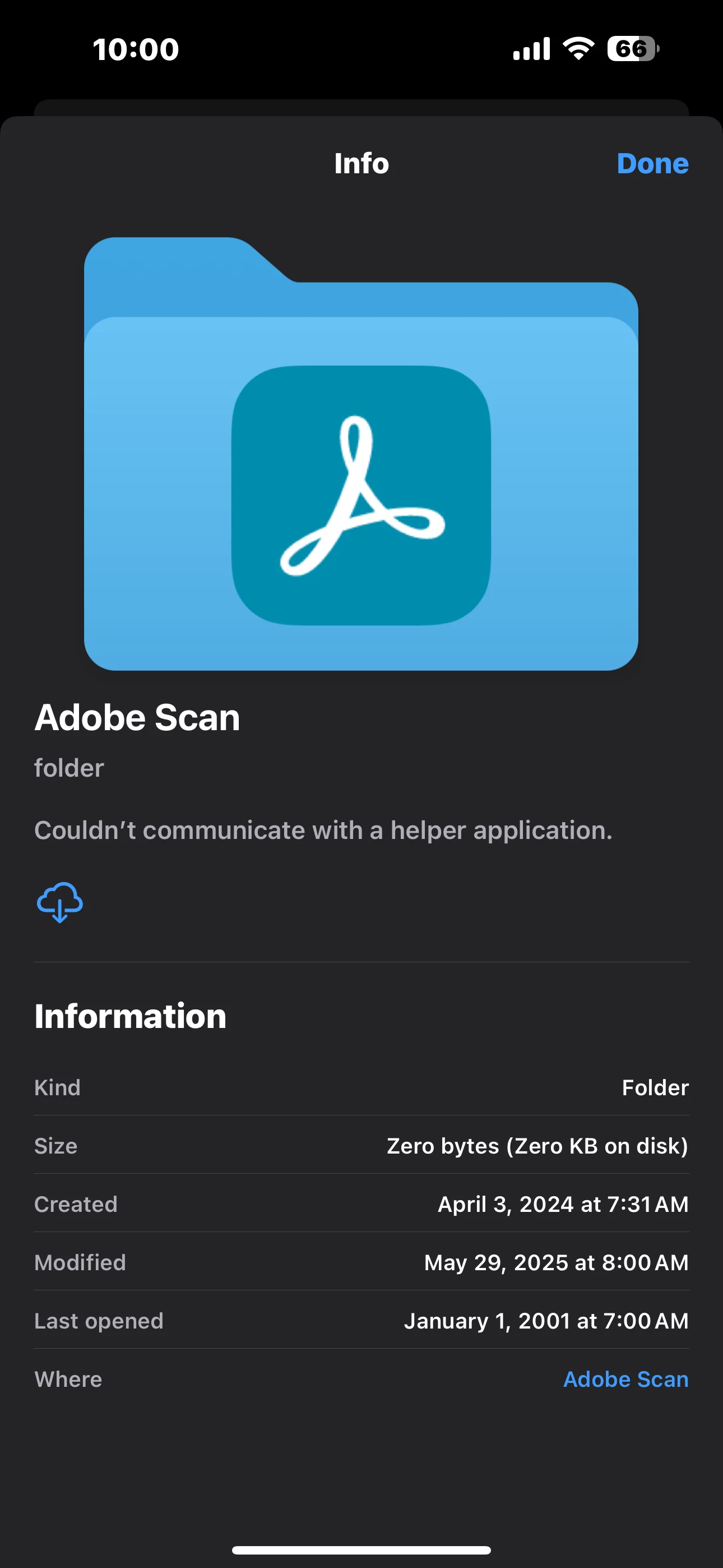 Adobe Scan folder inside iOS Files app shows an error. Get Info for folder shows error message, couldn't communicate with a helper application.