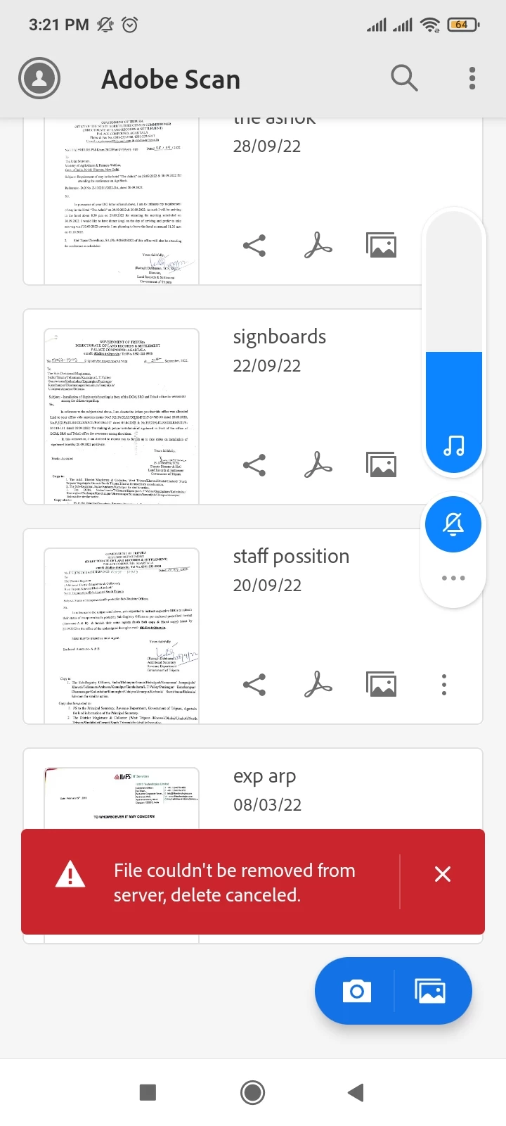 How to delete in adhobe scan application.it shows can't delete from server. But why