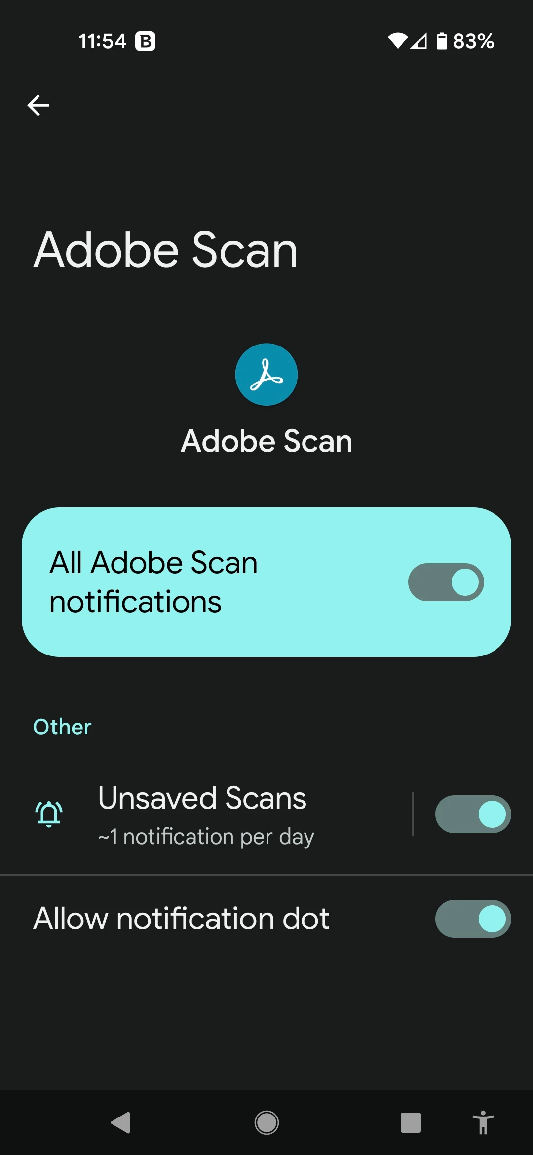 On my Android Pixel 4a I keep getting Notifications from Adobe Scan when I am NOT using Adobe Scan and have NO pending scans. The Notifications always say Don't forget your scan - nothing else and no explanation. I have nothing pending, I am not even using Scan at those times. How can I stop this message?