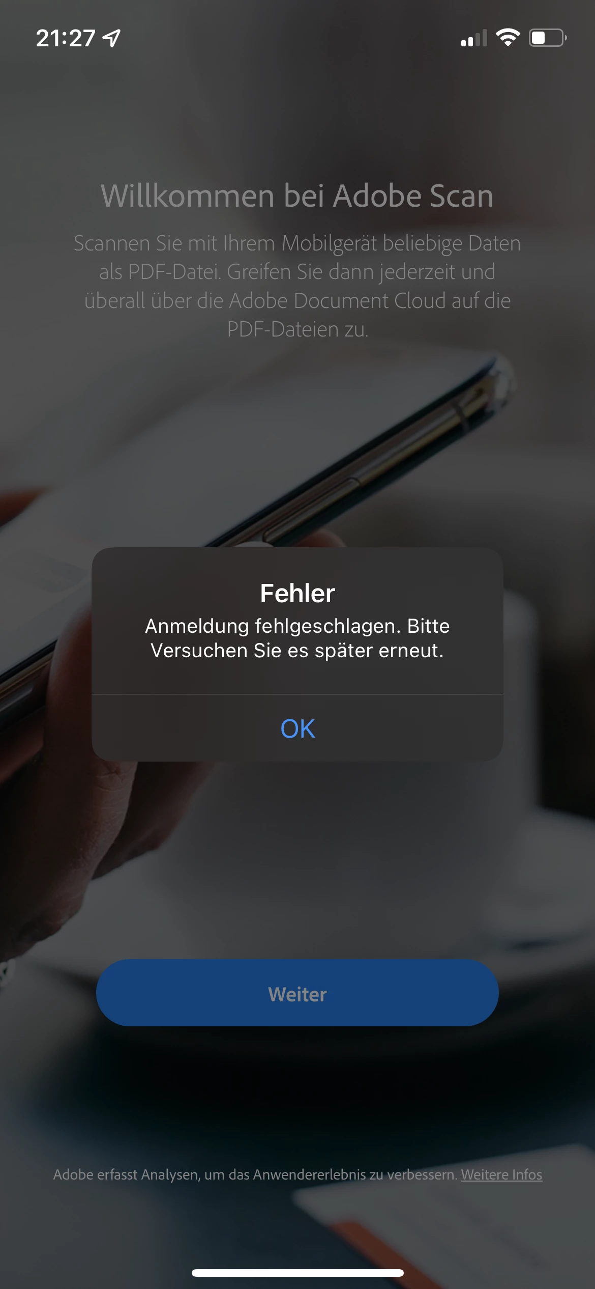 Also, just try with installing any alternate application from Adobe from the App Store ( Creative Cloud for example) and check if you are able to login to it. If it logs you in, your account should automatically be identified by Acrobat Reader Mobile and Adobe Scan too.