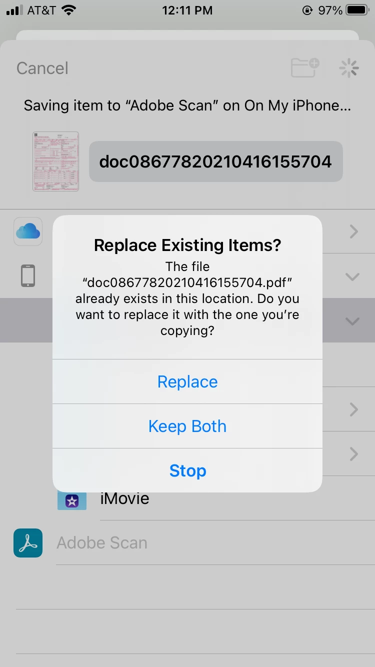But when i go to downliad again, adobescan asks if i want to replace, as the file "alresdy exists."